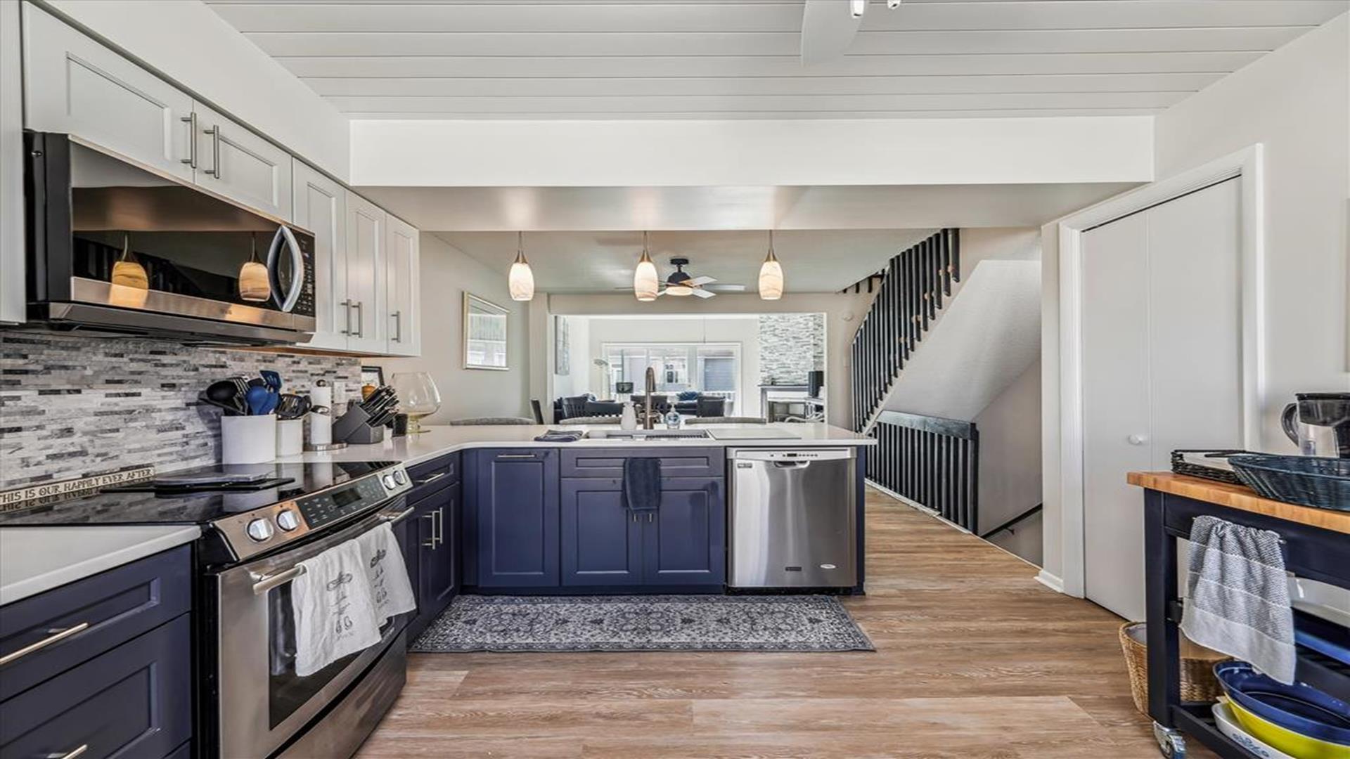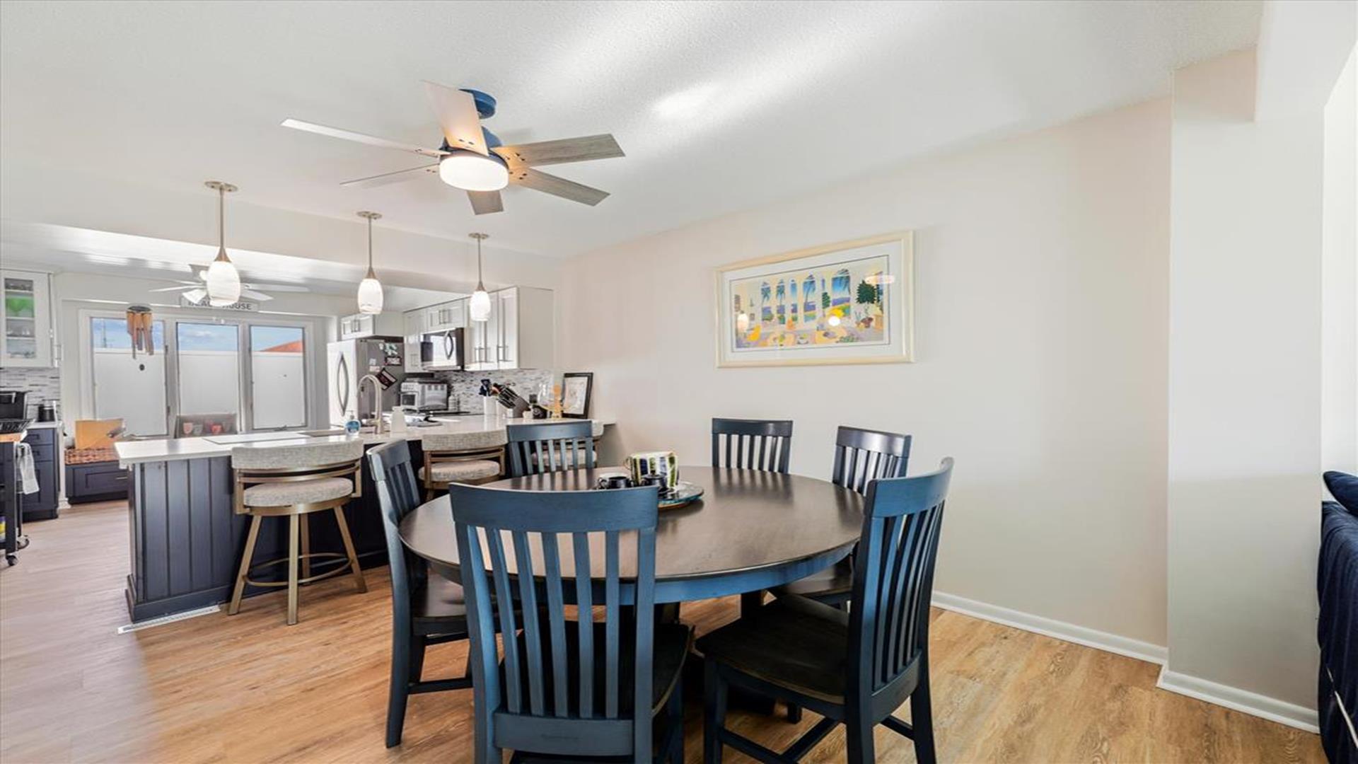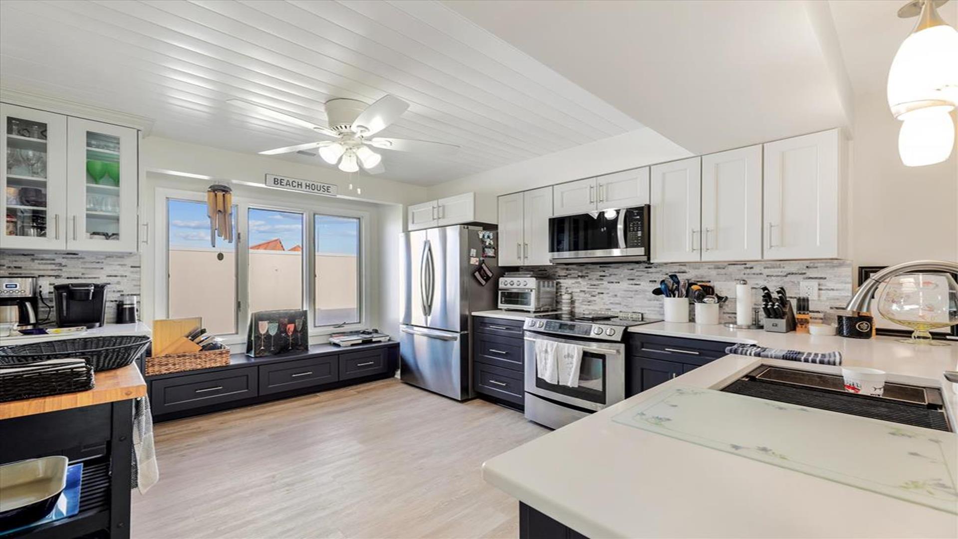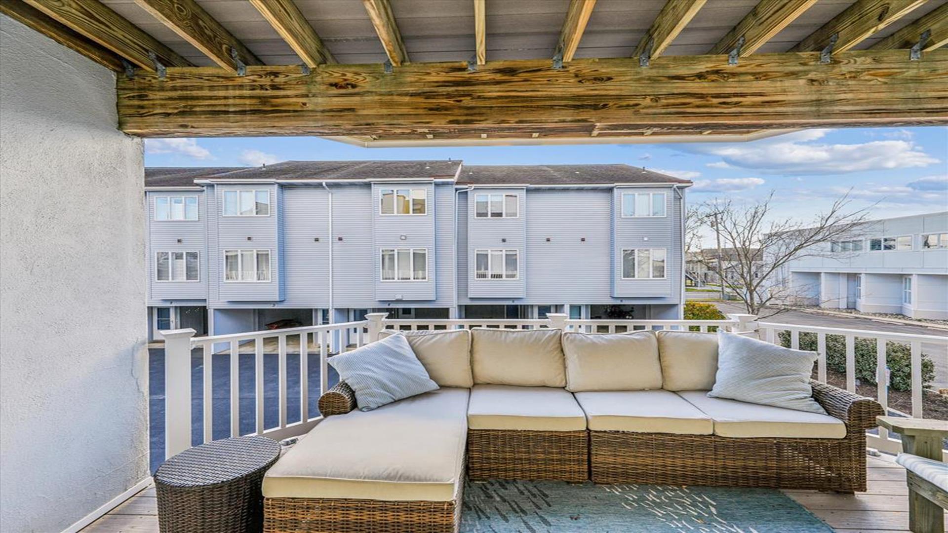 Great space just a block to the Ocean. New kitchen appliances, fresh painting throughout. 4 bedrooms, 3 full baths & 1 half baths. Central A/C, Washer/dryer, dishwasher. 4th bedroom is located on the ground level with separate entrance set up as efficiency from the main townhouse .Upper deck-round dining, 4 chairs, Chaise Master deck-couch, Adirondack chairs/table Carport- picnic table with the grill New patio off the efficiency area. One block to ocean.
