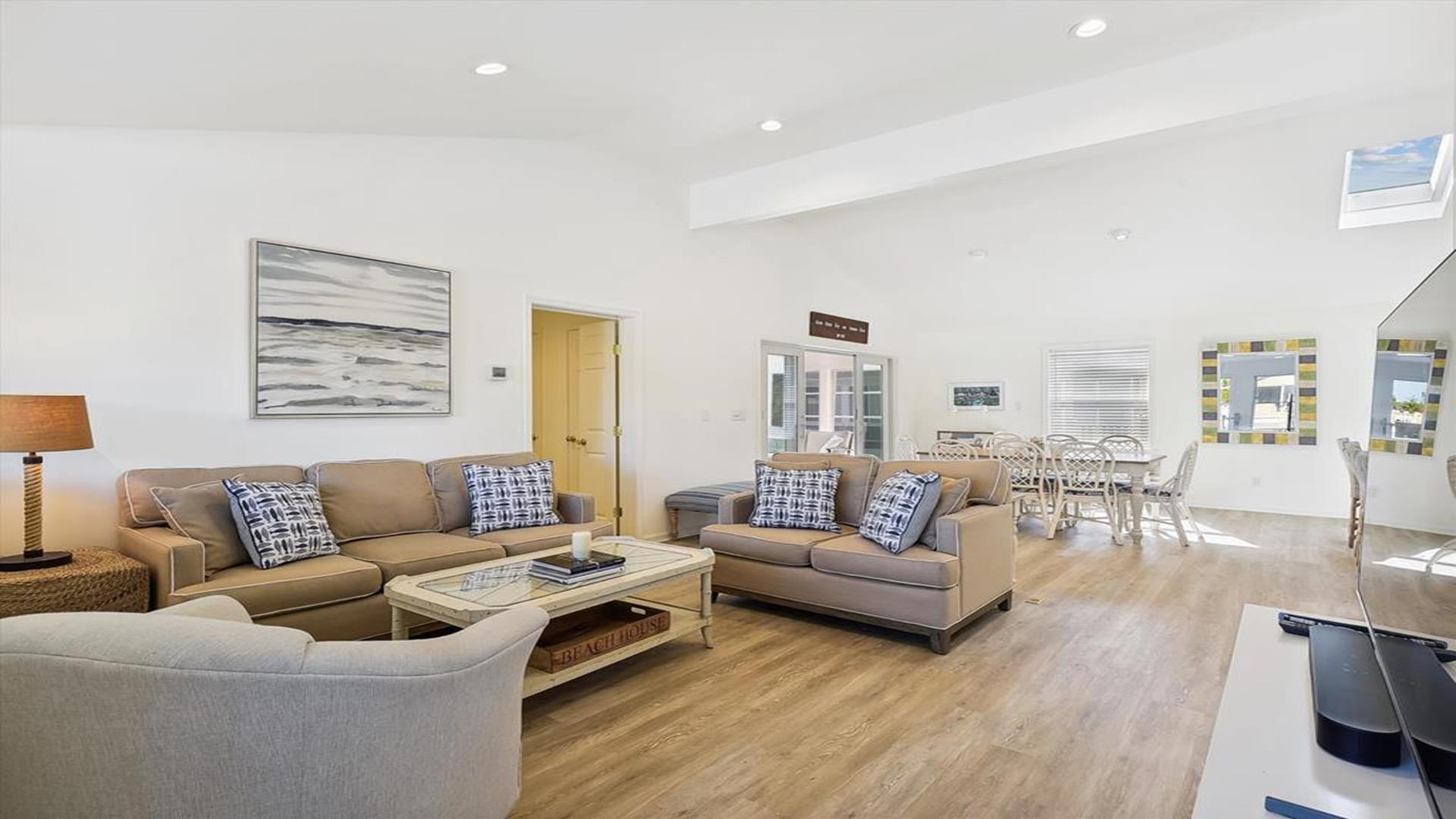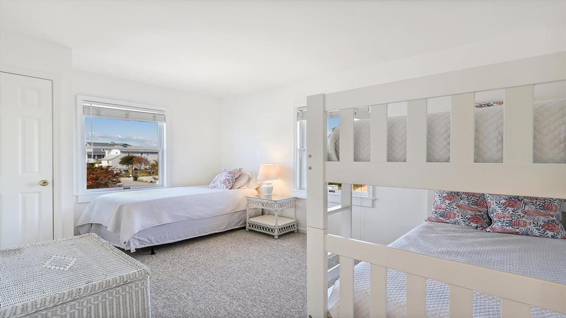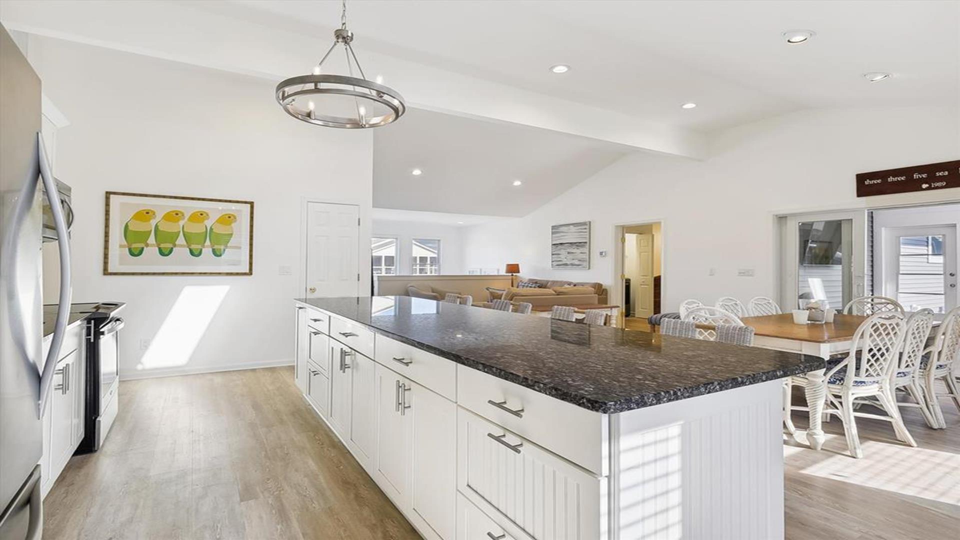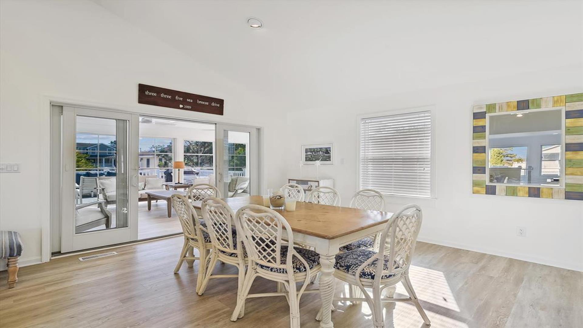 Welcome to yourvacation home in the charming Town of Bethany Beach, just a stone's throw away from the picturesque Ocean View Parkway. This newly remodeled gem is a spacious 5-bedroom, 4-bathroom haven that can comfortably accommodate up to 10 guests. Step inside to discover a sunlit open concept living space that seamlessly blends the kitchen, dining, and living areas. The layout offers the perfect balance of privacy with two distinct bedroom wings. The west end boasts 3 inviting bedrooms and 2 full baths, while the all-new east addition features 2 luxurious primary suites with their own private bathrooms. Entertainment abounds in the new three-season room, complete with a 65” smart TV and a game table for endless fun. Step outside onto the expansive sun deck, ideal for grilling and socializing under the sun. This stunning home is adorned with new flooring, a full-sized LG washer and dryer, a 10’ kitchen island/breakfast bar, built-in desk/charging station, and two 65” smart TVs for your viewing pleasure. Additionally, two brand-new outdoor showers and ample parking add to the convenience and comfort of your stay. Nestled in The Canal neighborhood, just 4 blocks from the beach, 335 Seabreeze offers a peaceful retreat with a large yard on a corner lot. Enjoy the tranquility of the area while being within walking distance to the beach and town. For added convenience, the free Bethany Beach Trolley stops right at your doorstep. This property is fully equipped with 1 King Bed, 2 Queen Beds, 3 Single Beds, 1 Bunk Bed, and 1 Portable Crib. Amenities include a dishwasher, microwave, central AC, washer, dryer, cable TV, gas BBQ, and more. Please note that this is a smoke-free property and pets are not allowed. Don't miss out on the opportunity to create lasting memories in this exquisite vacation home. Book your stay at 335 Seabreeze today and experience the best of Bethany Beach living!