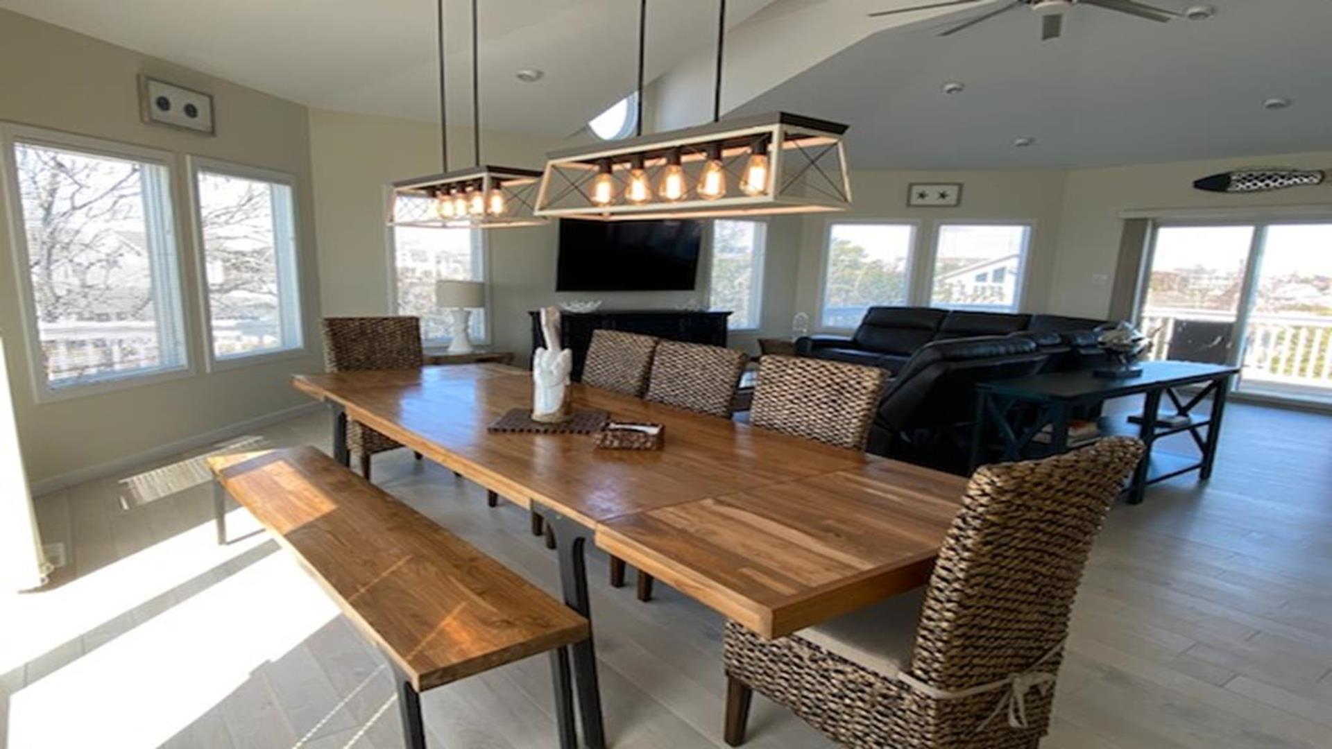 Lagoon front. Lovedladies. Dock. Decks. Beach Badges. Bikes. Ping Pong table. Foosball. WIFI. Gorgeous reverse-living Loveladies contemporary on a private easement that is bright, airy and very spacious. It is located on lagoon w/ docking space. Includes 4 bedrooms – 2 of which have king sized beds w/ en suite baths – plus a den with sofabed making the occupancy 12. Top floor has a huge great room – dining area w/ table large enough to seat 12 – Kitchen w/ white cabinets and stainless steel appliances plus tons of counter space. . Among the amenities – New W/W Carpet in Bedrooms of the house - 4 Smart TV’s – 2 Gas Grills (1 on ground level and 1 on top deck off kitchen ) – Updated Composite Dock – Large Ground Level Deck – Ping Pong and foosball table are in garage and with an extra refrigerator. Decks off both floors with lovely lagoon views; Roof top deck, with lagoon view – plenty of parking. Bikes for tenant use.10 Beach Badges provided, but not guaranteed