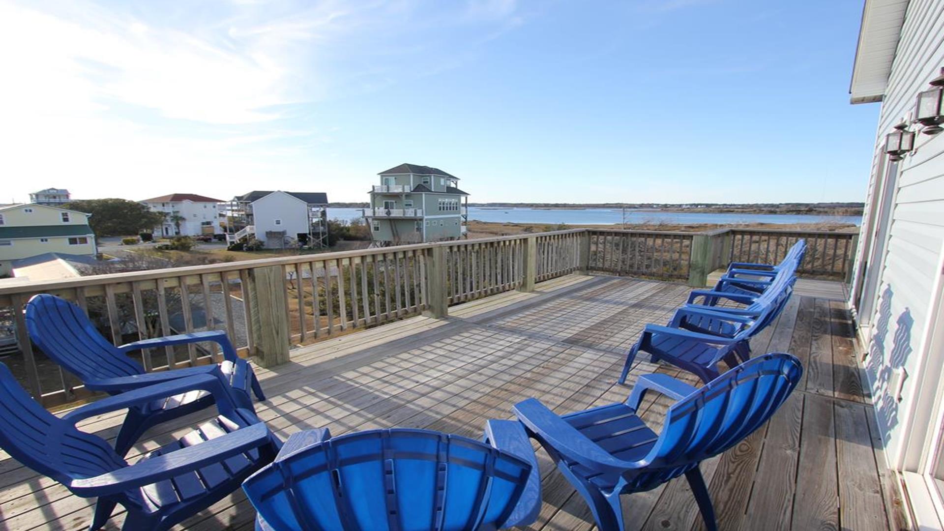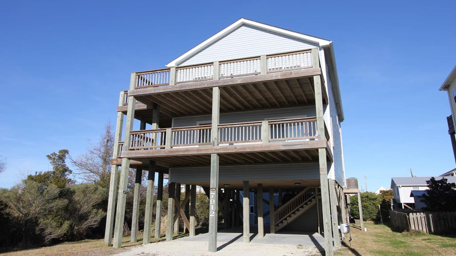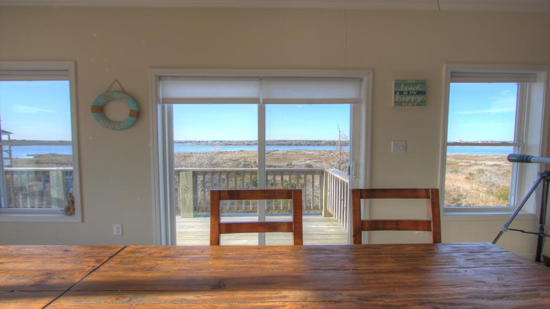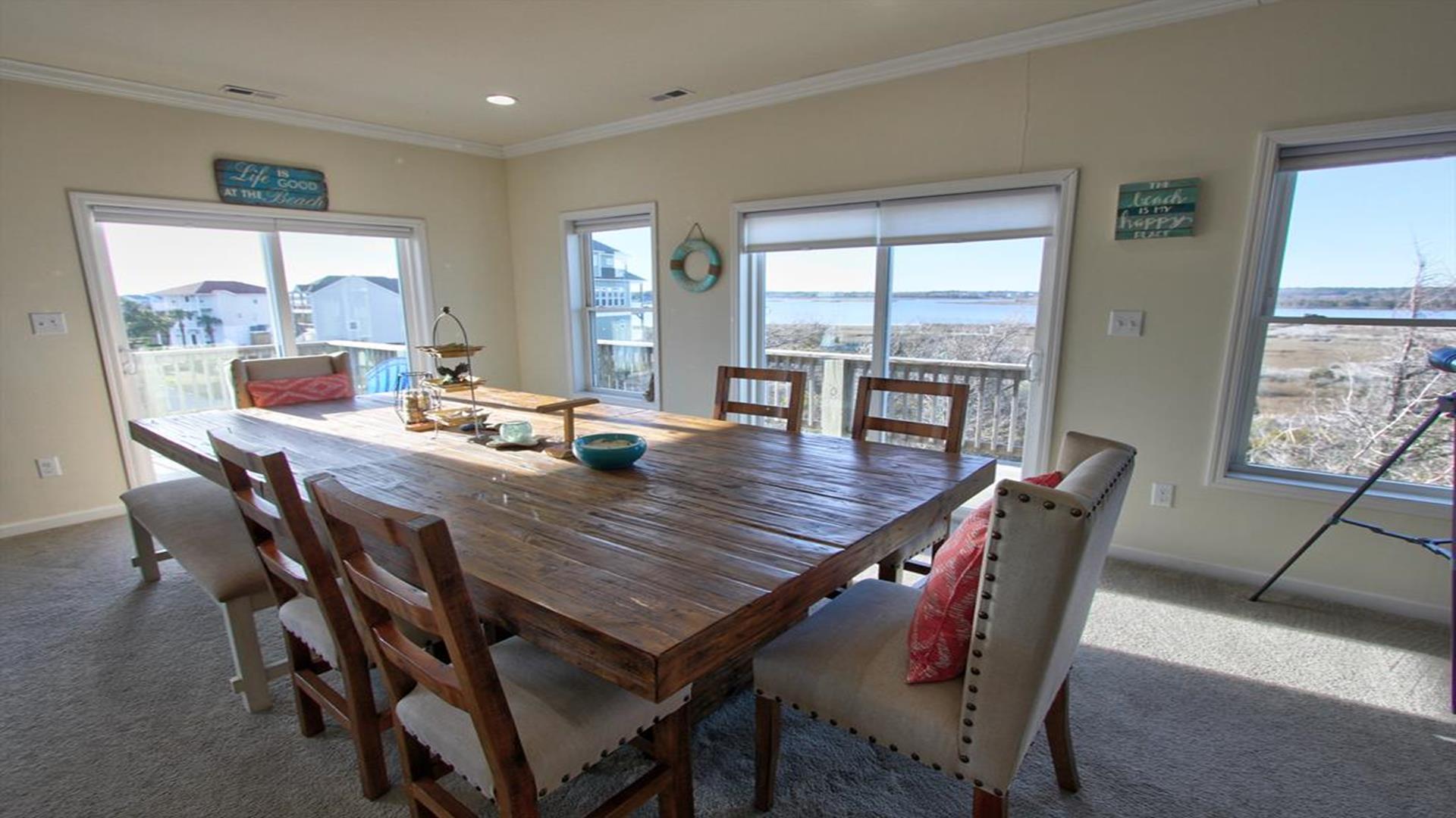 Enjoy amazing water views from this beautiful beach house. From the large wraparound decks, you can see the ocean, beach access, and panoramic views of the waterway. On the top floor with the best views, there is a spacious living, dining, and kitchen area. The huge dining table is perfect for family meals and gathering for games. There is a king bedroom with a private bath along with a half bath on this level. On the first floor, there is another king bedroom with private bath and a door to the covered deck. The third bedroom has two queen beds. The fourth bedroom has a pyramid bunkbed and a double bed. There is a hall bath with tub/shower and a separate laundry room. On the ground level, there is a covered area with furniture, grill, and storage building. The beach access is only a short distance away and best of all, you can bring your pet w/$215 fee for 1 dog. *Keyless Entry, Exterior Security Camera 4 BR, 3.5 Baths / Occupancy Limit: 12 - 2 K, 2 Q, 2 D, 1 T, LINENS ARE NOT INCLUDED unless purchased NO SMOKING ALLOWED