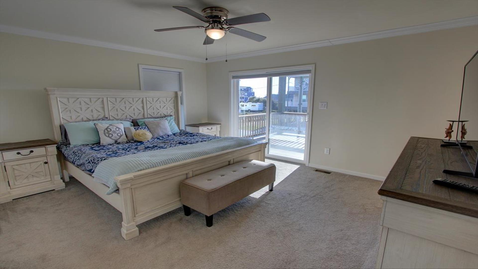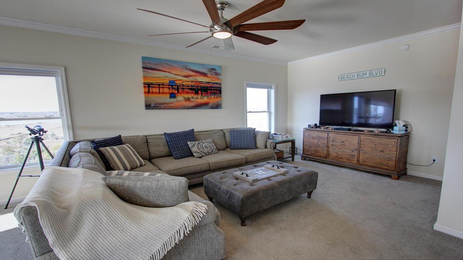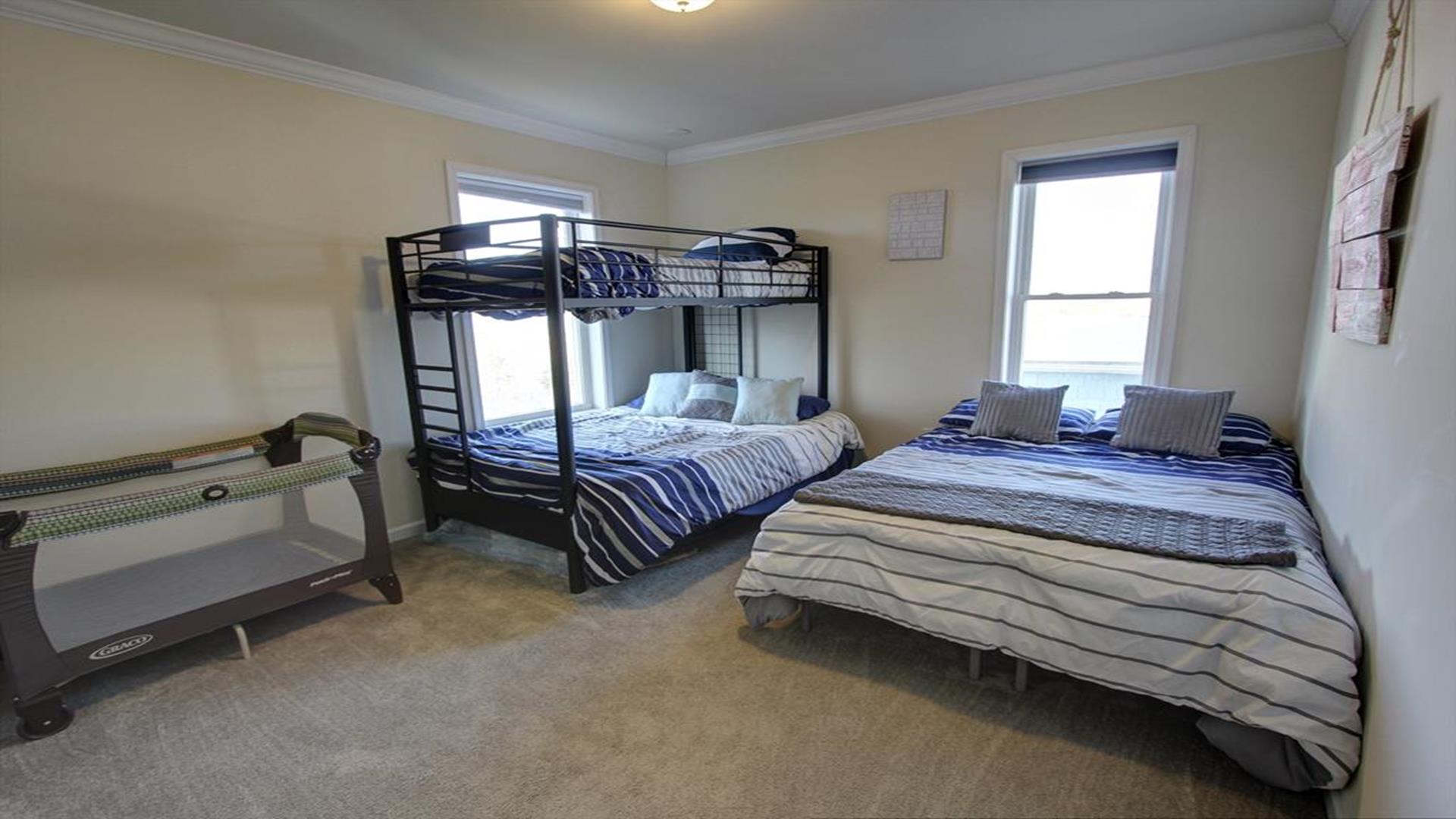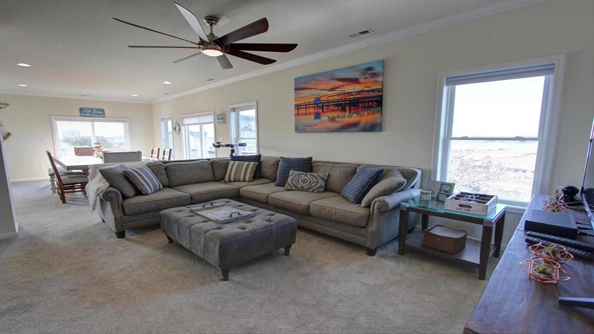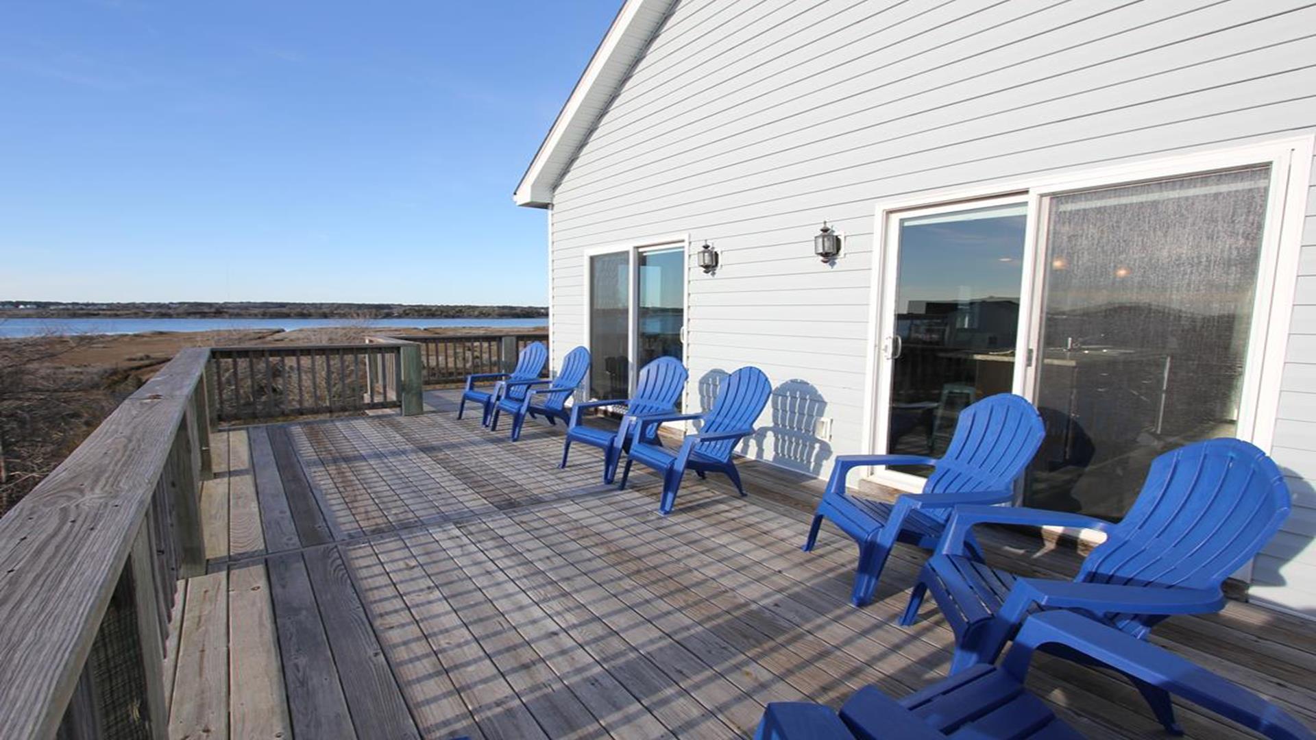 Enjoy amazing water views from this beautiful beach house. From the large wraparound decks, you can see the ocean, beach access, and panoramic views of the waterway. On the top floor with the best views, there is a spacious living, dining, and kitchen area. The huge dining table is perfect for family meals and gathering for games. There is a king bedroom with a private bath along with a half bath on this level. On the first floor, there is another king bedroom with private bath and a door to the covered deck. The third bedroom has two queen beds. The fourth bedroom has a pyramid bunkbed and a double bed. There is a hall bath with tub/shower and a separate laundry room. On the ground level, there is a covered area with furniture, grill, and storage building. The beach access is only a short distance away and best of all, you can bring your pet w/$215 fee for 1 dog. *Keyless Entry, Exterior Security Camera 4 BR, 3.5 Baths / Occupancy Limit: 12 - 2 K, 2 Q, 2 D, 1 T, LINENS ARE NOT INCLUDED unless purchased NO SMOKING ALLOWED
