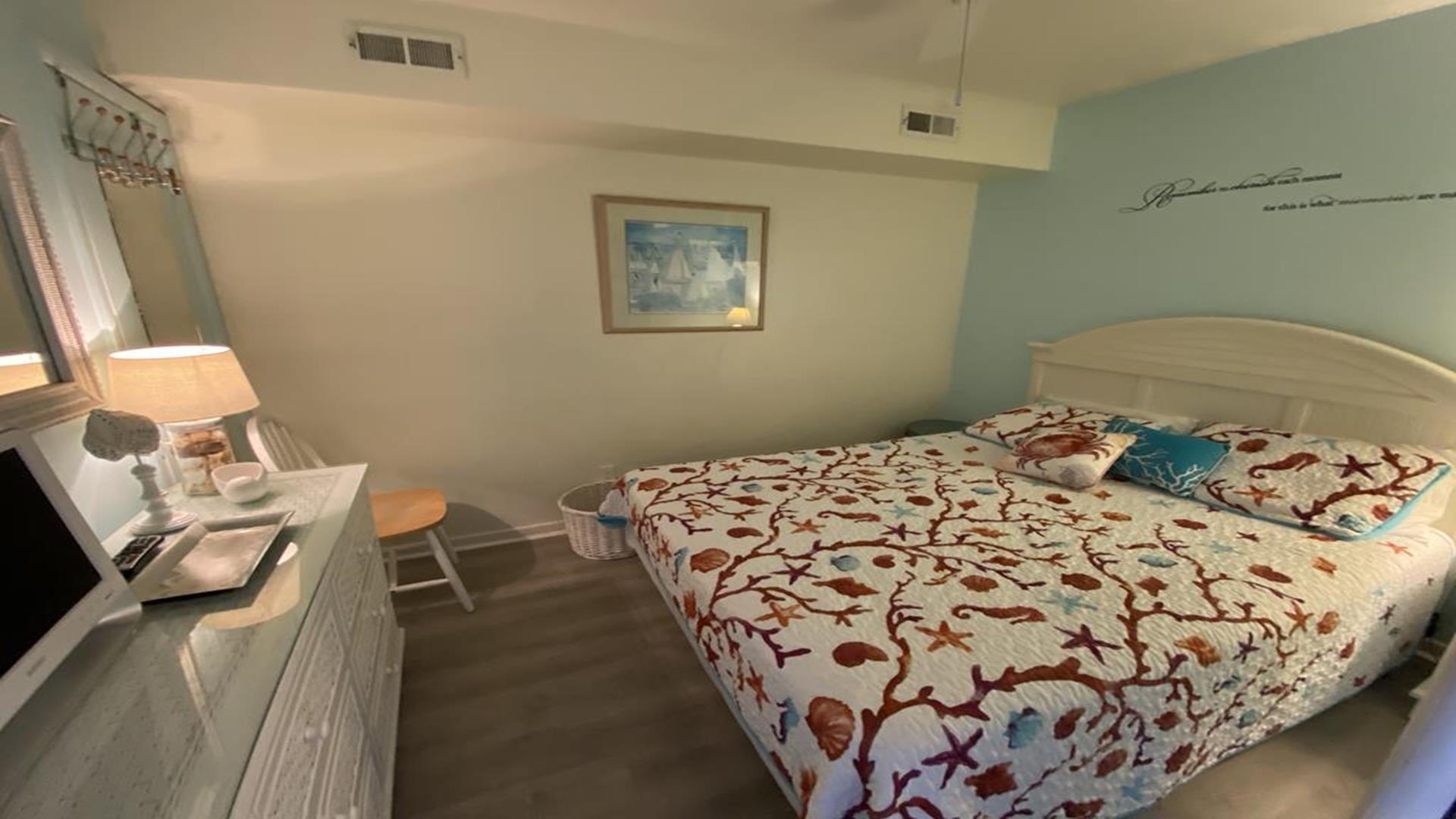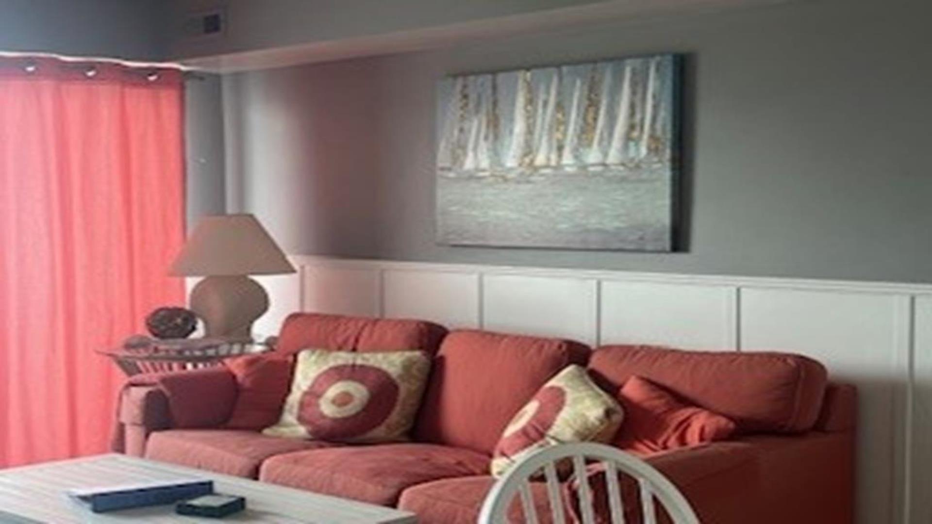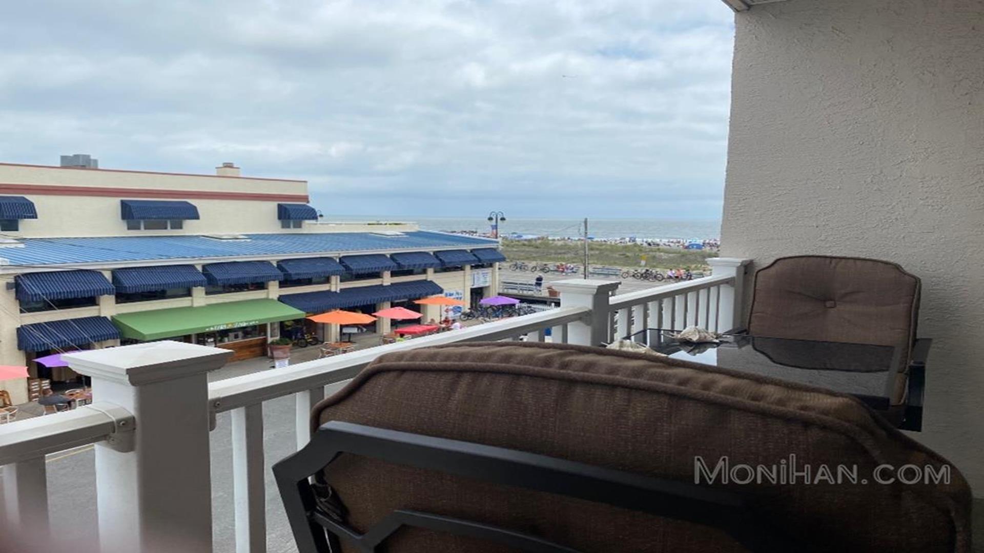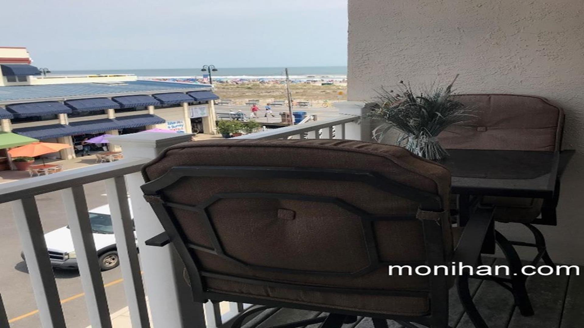 BEACH, BOARDWALK AND POOL! This ocean view condo is waiting for you! Beautiful one bedroom, one bath north side unit in a boardwalk fronted building overlooking 14th Street and Bob's Grill, sleeps up to 4 people. Private balcony with ocean views, full size fridge, dishwasher, private bedroom, central air cable tv, internet, queen sofa bed and futon in living room, extra pillows and two beach tags. The Building features an elevator, one assigned off street garage parking space, bike rack, outside shower, POOL (open daily 10-5 mid-June through mid September.) This is a great place to stay and enjoy Ocean City!