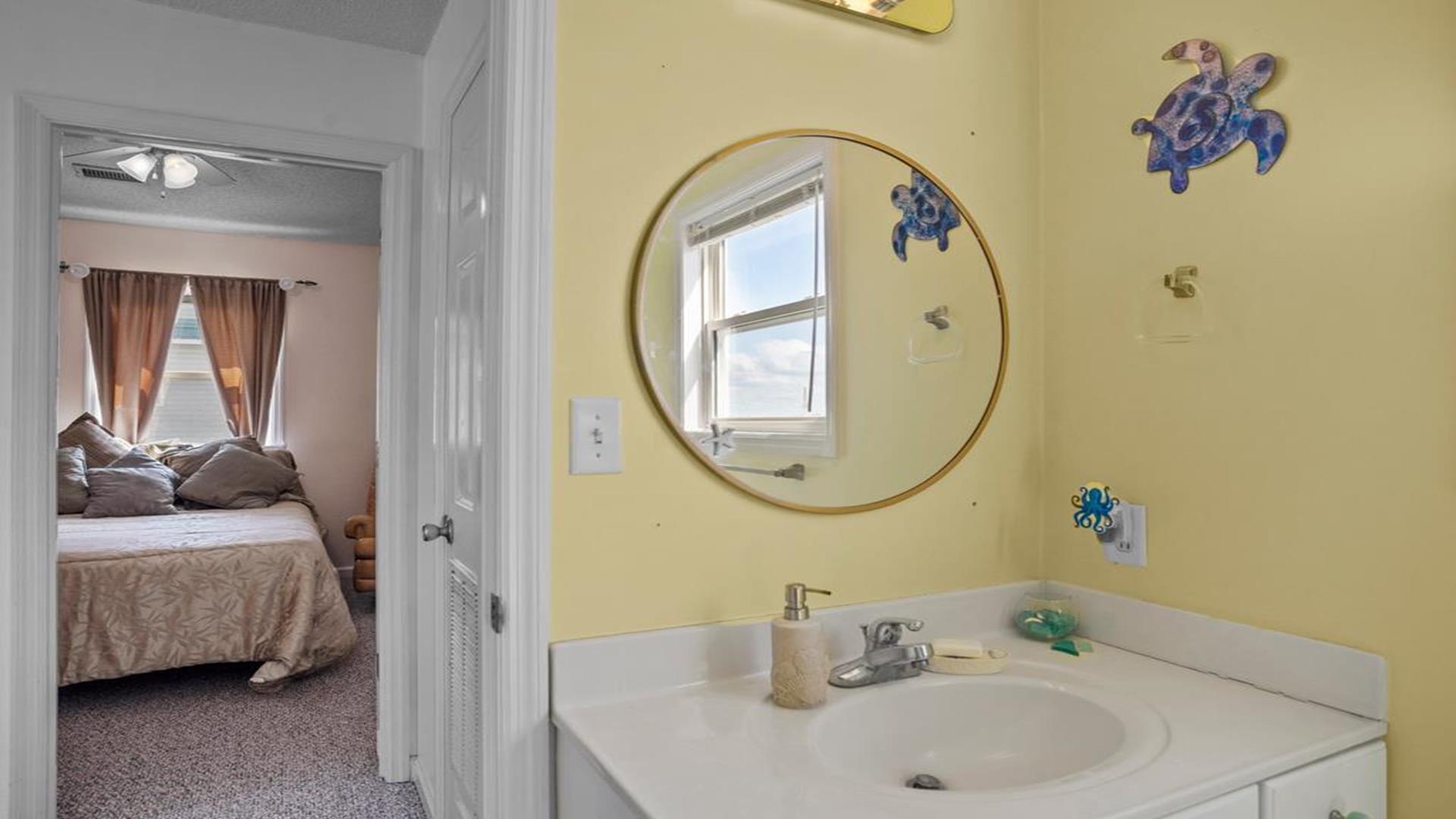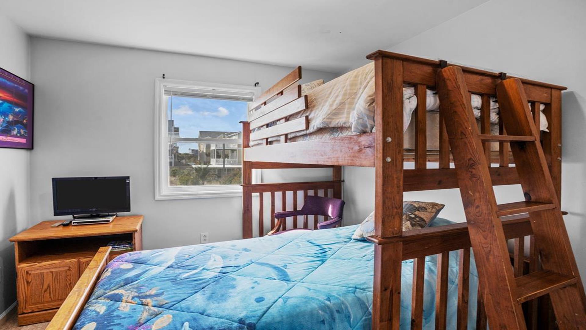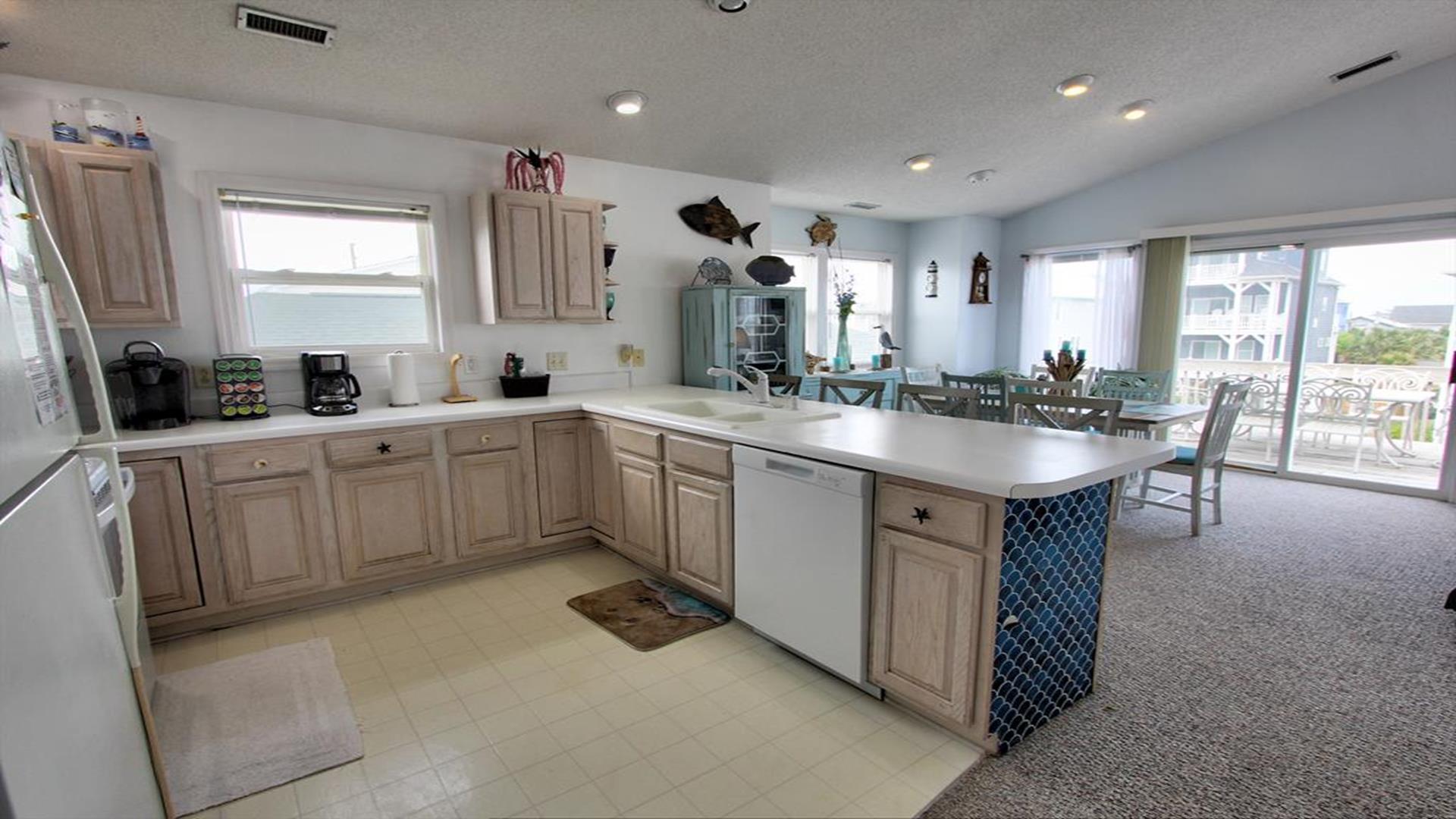 Hook, Wine, & Sinker . . .Beach nearby, wraparound decks, and ocean views! Enjoy wonderful view of the ocean from the decks of this comfy home located on a quiet street with beach access only steps away. The living, dining, & kitchen area are on the top floor with a king bedroom and shower bath. This level has a huge sundeck with built-in benches and dining table. The first floor has a covered deck with porch swing to enjoy the ocean breezes. The master bedroom has a queen bed and tub/shower bathroom. The other bedrooms on this level have a double bed and twin bed in one and two twin beds in a turned bunk bed. The hall bath is a shower bath, and the laundry room is also on this level. The outdoor shower on the ground level is enclosed with hot and cold water. 4 BR, 3 Baths / Occupancy Limit: 9 - 1 K, 1 Q, 1 D, 1 T, 1 BB (2T). LINENS NOT PROVIDED UNLESS PURCHASED. PETS ALLOWED w/$215 Fee for 1 dog, NO SMOKING ALLOWED