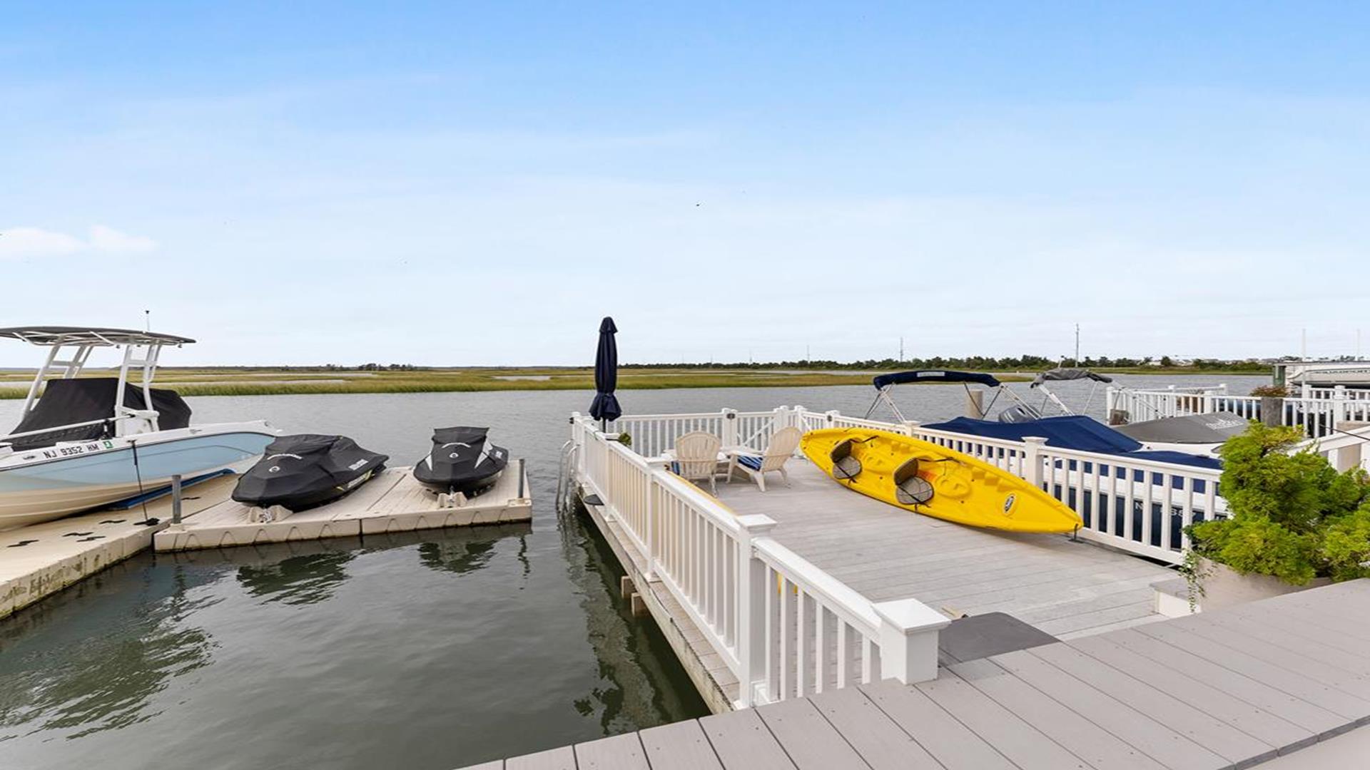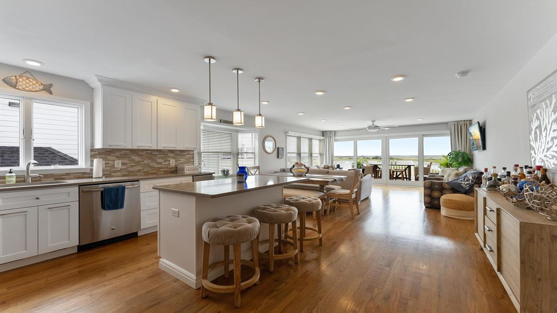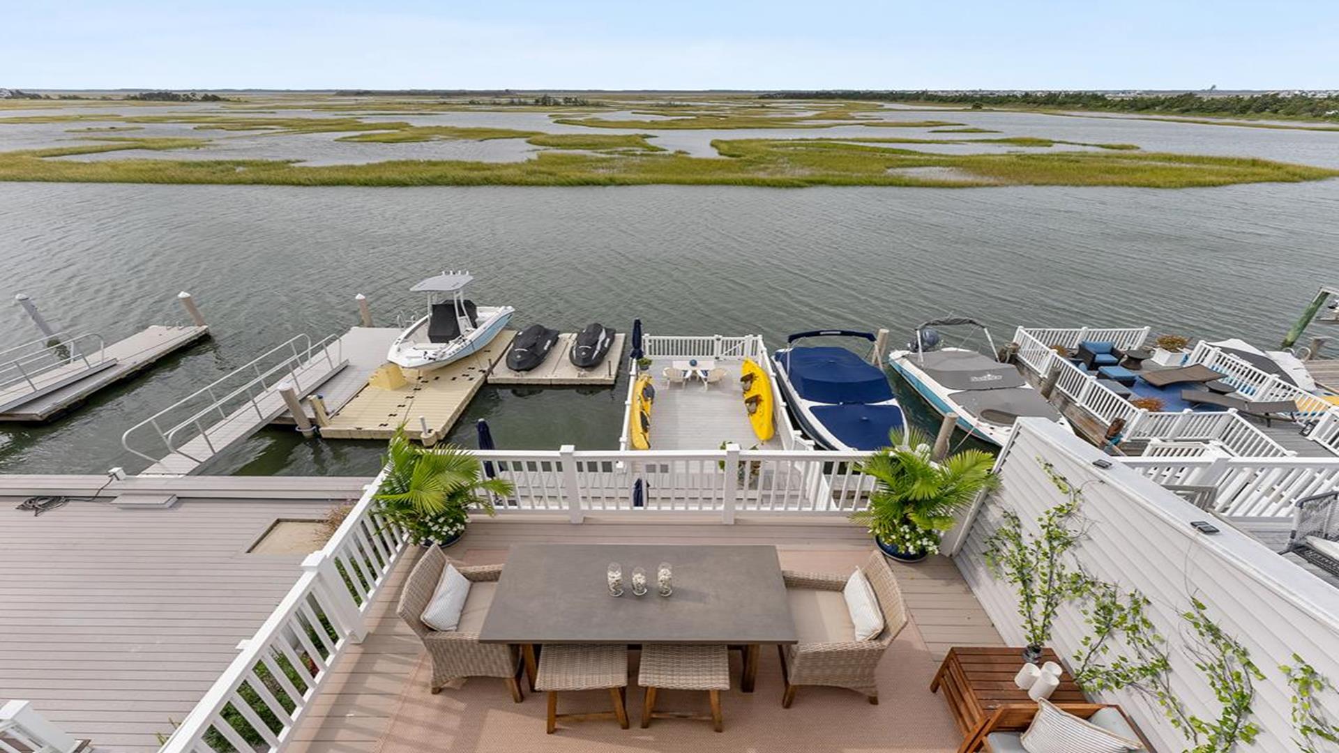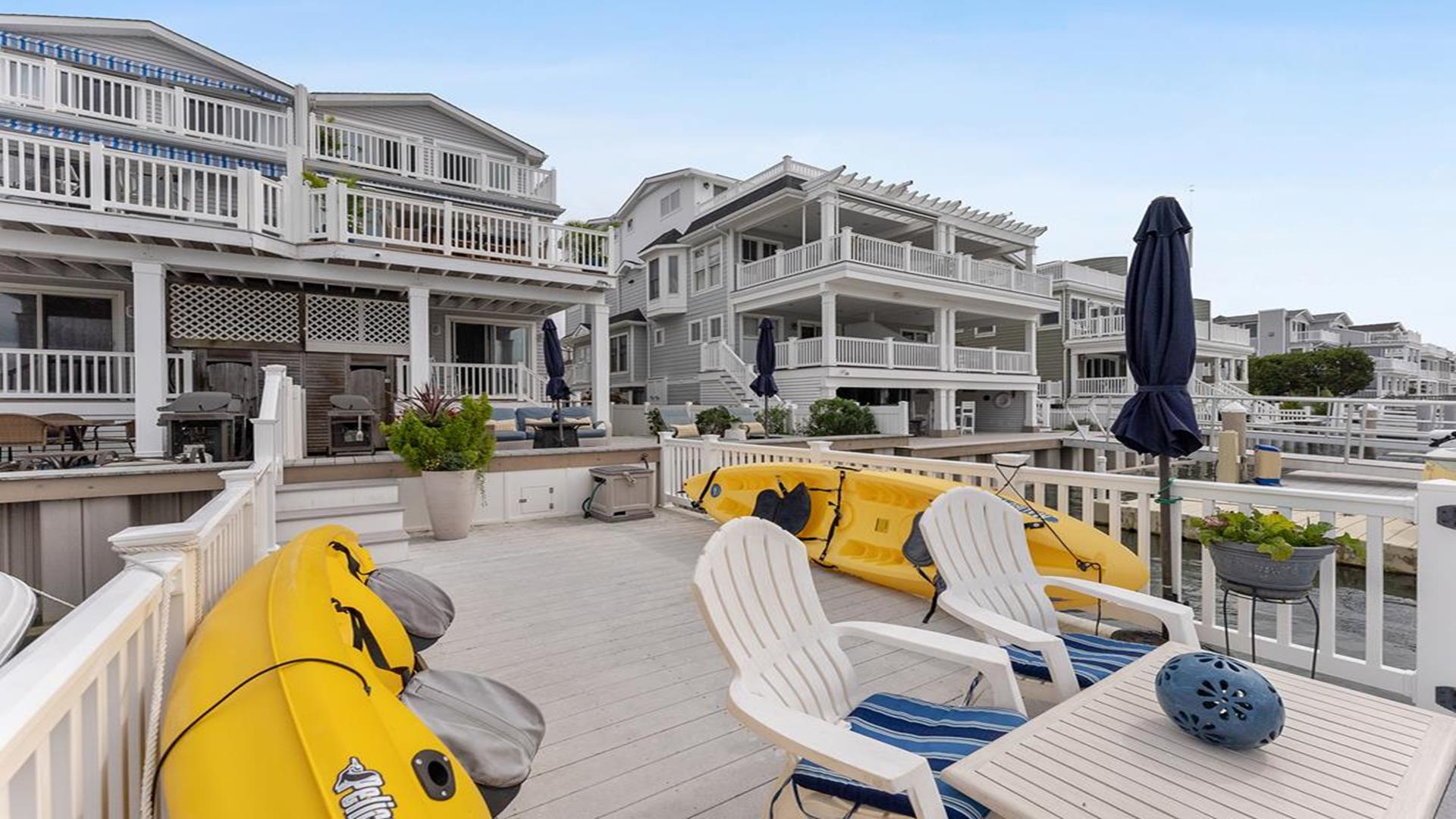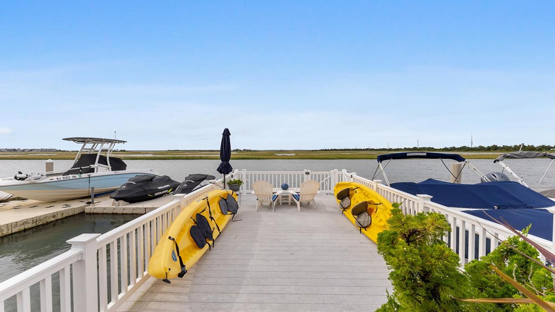 Stunning bayfront townhome! This completely renovated and stylishly furnished 4 bedroom, 4 full bath home features 1 boat slip with 2 jet ski ramps and a generously-sized pier reserved exclusively for the south unit. The ground-level bayside deck and pier offer ample space for entertainment, where you can lounge in the sun or enjoy water activities like kayaking, paddleboarding, or boating. Enjoy the most exquisite bay and sunset panoramas Avalon has to offer! Perfectly situated just a short walk away from both the beach and downtown Avalon. The first level floor boasts a generously-sized family room with a television, a queen sleeper sofa, and convenient access to the bayside dock and deck. A bedroom on this level features a queen-sized bed with an adjacent hallway bathroom. The bright and sunlit second-floor great room features a well-appointed kitchen with a center island, hardwood floors, and access to the bay-view deck. Both the indoor and outdoor dining areas offer comfortable seating for both family and guests. You can also enjoy breathtaking views from the second and third-floor decks while dining al fresco. The second-story deck features a new awning, perfect for enjoying afternoon shade or taking a siesta. On the second floor, you'll find a full bath in the hallway along with two bedrooms, and 2 bathrooms. One of these bedrooms is furnished with a full-sized bed and a pair of twin bunk beds, while the other bedroom features a king-sized bed. Enjoy the master suite on the third floor with a king-sized bed, an ensuite bathroom with a bathtub & shower and private deck. Extra amenities include an enclosed outdoor shower, electric car charger, three televisions, wireless internet, access to the garage for your bikes & gear, (1) off-street parking space, (2) double kayaks, (1) paddleboard and an assortment of bayfront floats & toys. Availability is limited.... reserve your Avalon vacation today!