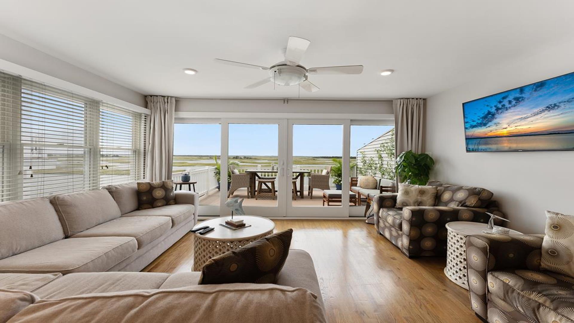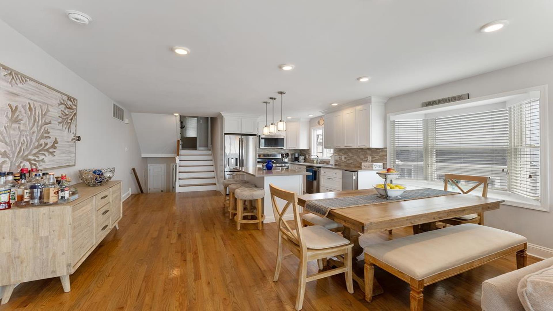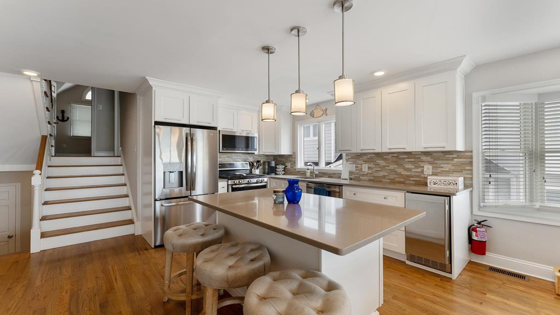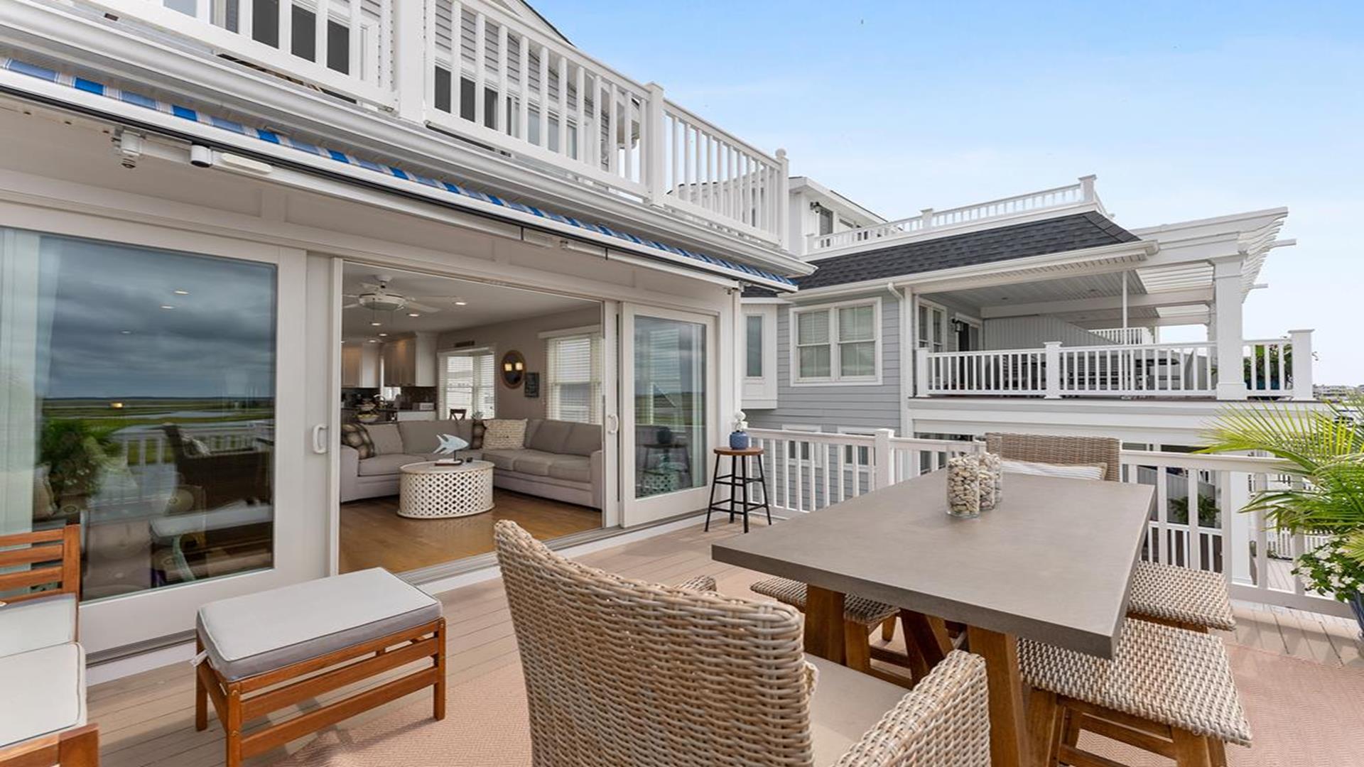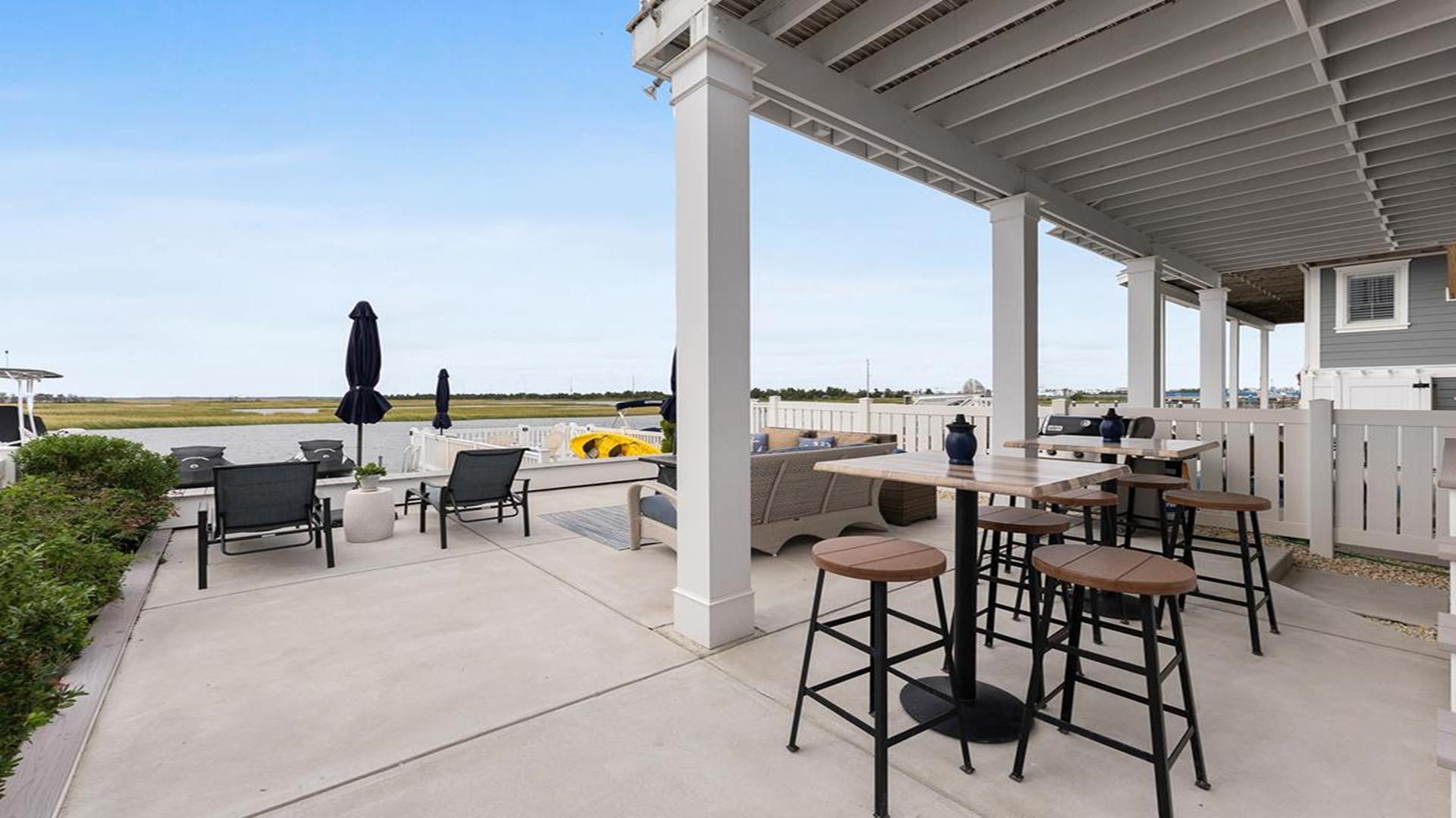 Stunning bayfront townhome! This completely renovated and stylishly furnished 4 bedroom, 4 full bath home features 1 boat slip with 2 jet ski ramps and a generously-sized pier reserved exclusively for the south unit. The ground-level bayside deck and pier offer ample space for entertainment, where you can lounge in the sun or enjoy water activities like kayaking, paddleboarding, or boating. Enjoy the most exquisite bay and sunset panoramas Avalon has to offer! Perfectly situated just a short walk away from both the beach and downtown Avalon. The first level floor boasts a generously-sized family room with a television, a queen sleeper sofa, and convenient access to the bayside dock and deck. A bedroom on this level features a queen-sized bed with an adjacent hallway bathroom. The bright and sunlit second-floor great room features a well-appointed kitchen with a center island, hardwood floors, and access to the bay-view deck. Both the indoor and outdoor dining areas offer comfortable seating for both family and guests. You can also enjoy breathtaking views from the second and third-floor decks while dining al fresco. The second-story deck features a new awning, perfect for enjoying afternoon shade or taking a siesta. On the second floor, you'll find a full bath in the hallway along with two bedrooms, and 2 bathrooms. One of these bedrooms is furnished with a full-sized bed and a pair of twin bunk beds, while the other bedroom features a king-sized bed. Enjoy the master suite on the third floor with a king-sized bed, an ensuite bathroom with a bathtub & shower and private deck. Extra amenities include an enclosed outdoor shower, electric car charger, three televisions, wireless internet, access to the garage for your bikes & gear, (1) off-street parking space, (2) double kayaks, (1) paddleboard and an assortment of bayfront floats & toys. Availability is limited.... reserve your Avalon vacation today!
