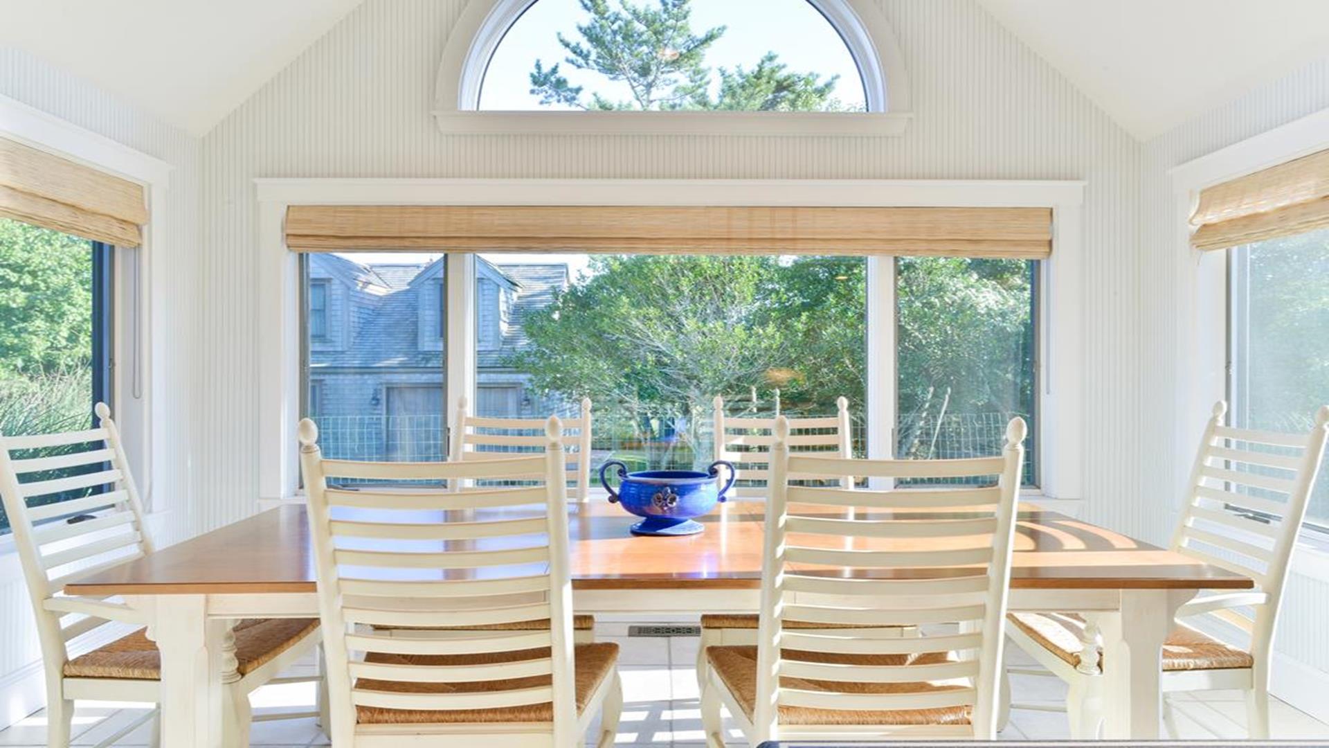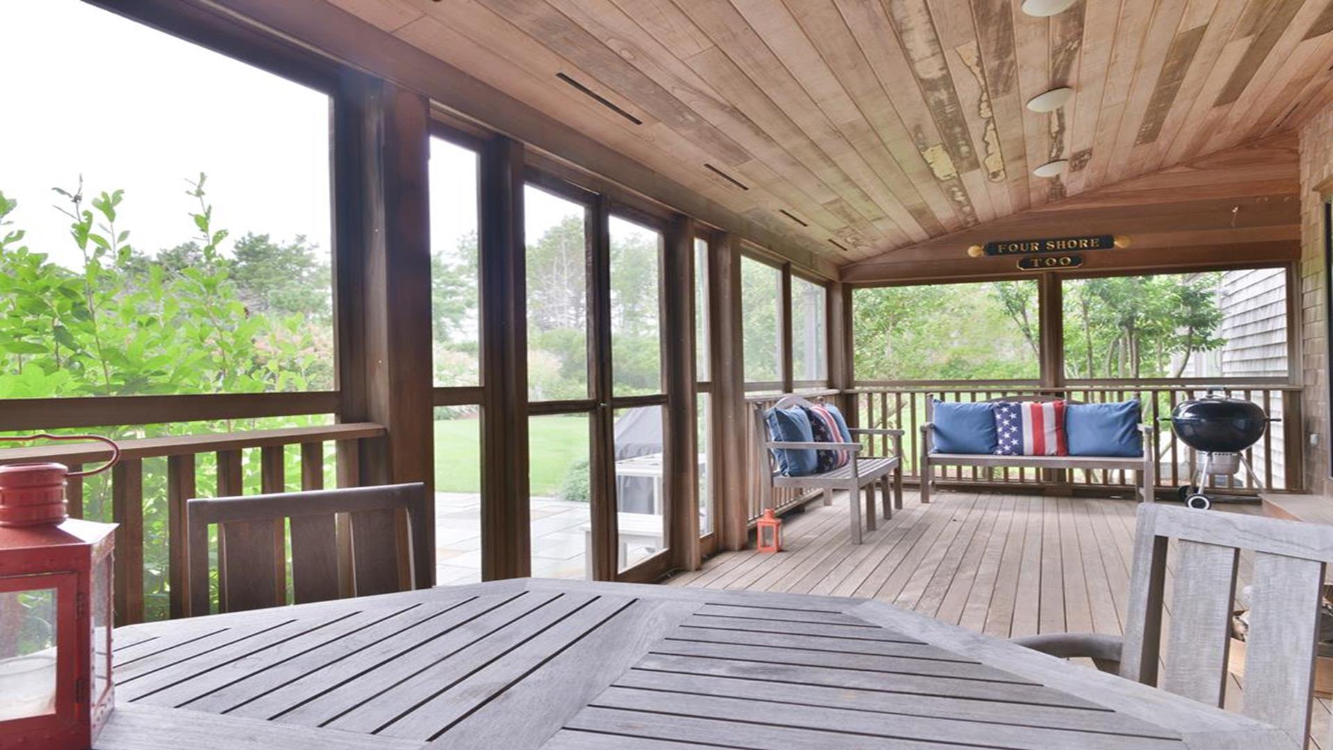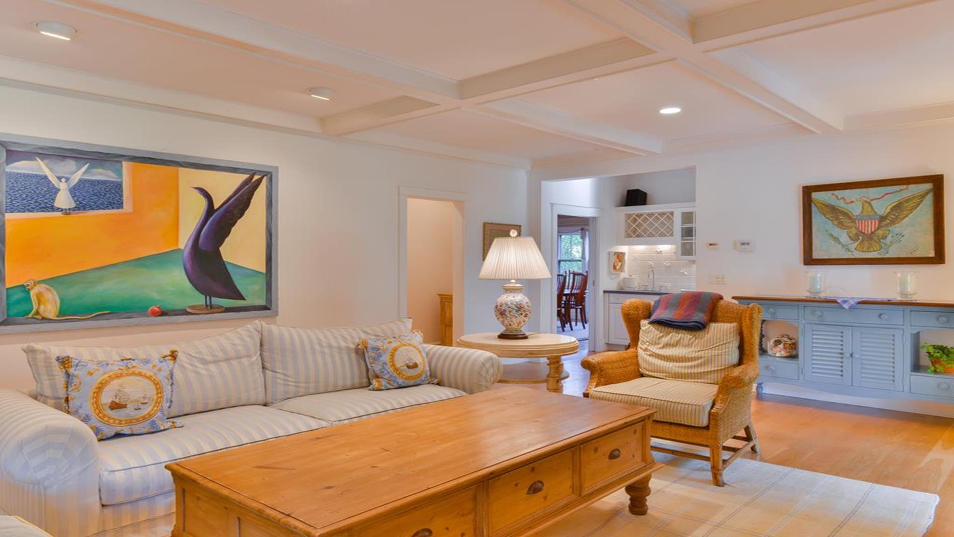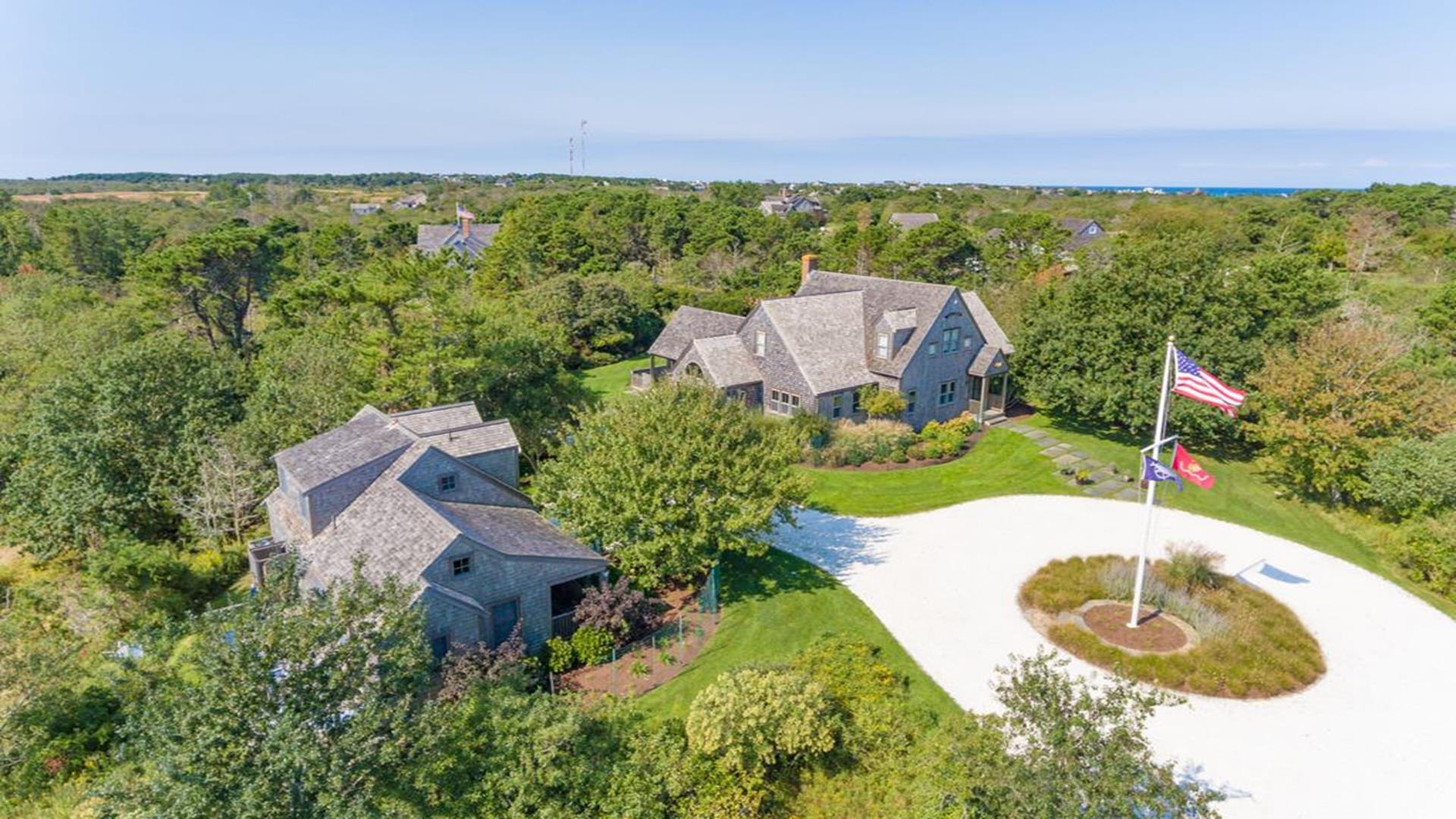 Situated west of Town near Cliff, Dionis and Madaket, this lovely property has 3-bedrooms in the main house, and 1-bedroom in the guest cottage. Main House: Enter through the foyer to a large family room that opens to the dining room with seating for 10. Adjacent to the dining room is a large living room with fireplace and sliding doors leading to the screened in porch, overlooking the bluestone patio with BBQ Grill and expansive manicured lawn. A large bright fully appointed kitchen with breakfast bar seats 3. There is also a charming breakfast nook with dining table seating for 6. Large laundry room, 2 pantries, a powder room and back door entry leading to the outdoor shower. A first floor Master Suite with King bed, sliding doors to back lawn and large bath with whirlpool tub, separate stall shower, dual sinks and decorative tile. Second floor: 2 queen bedrooms share full hall bathroom. Separate sitting area at the top of the stairs. Lower level: Home theater in basement seats 14. Guest cottage with 1-bedroom, kitchen, living room with pull out sofa in den and 2 full bathrooms. Large private deck.