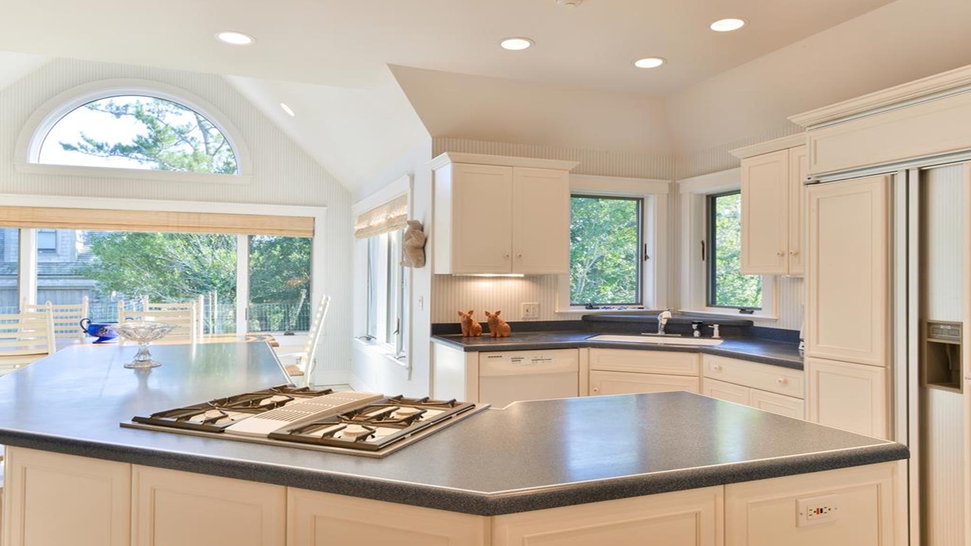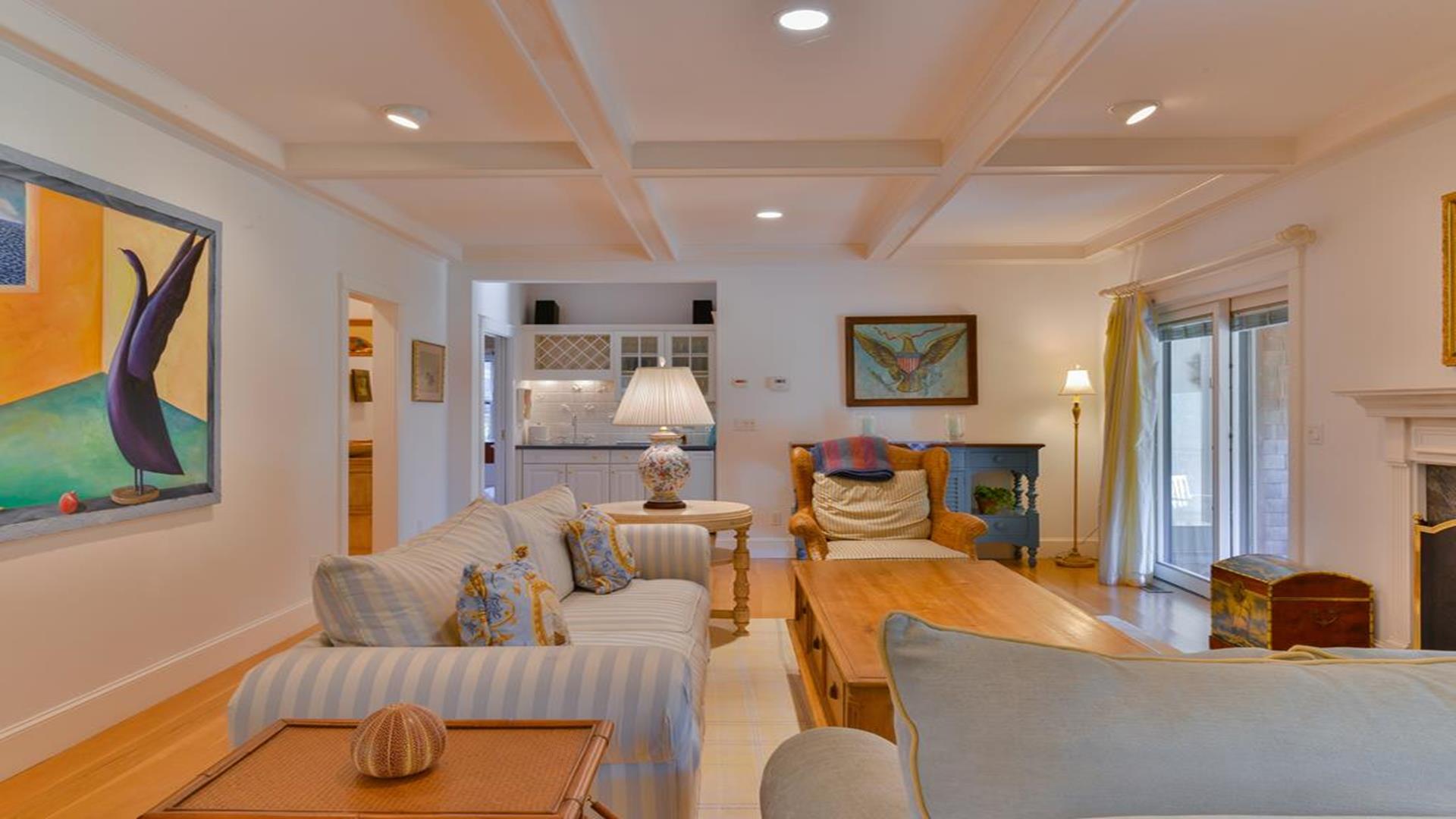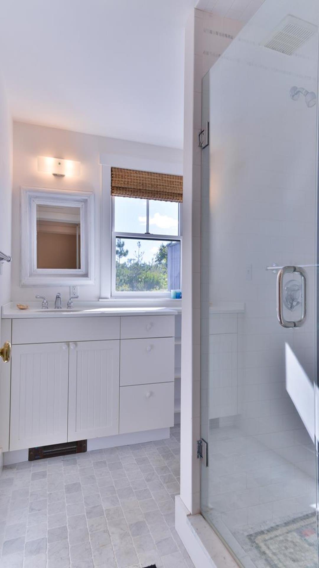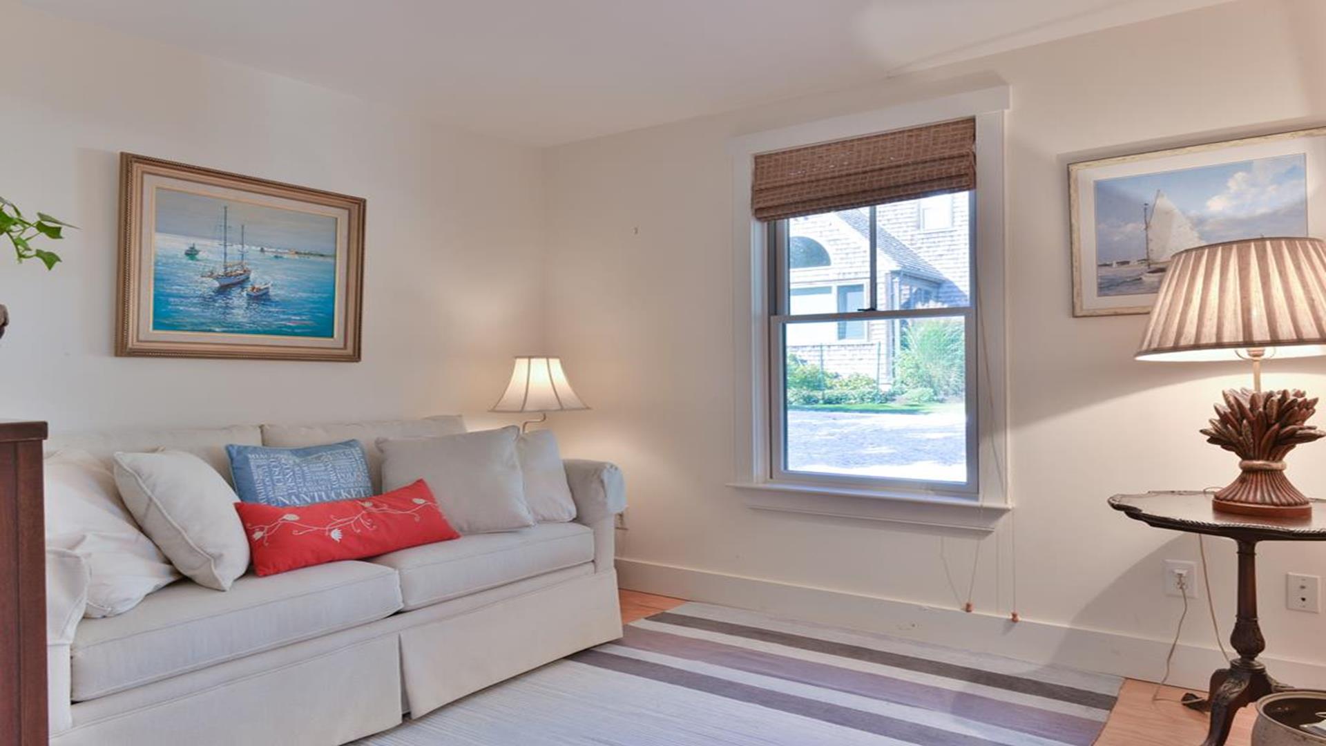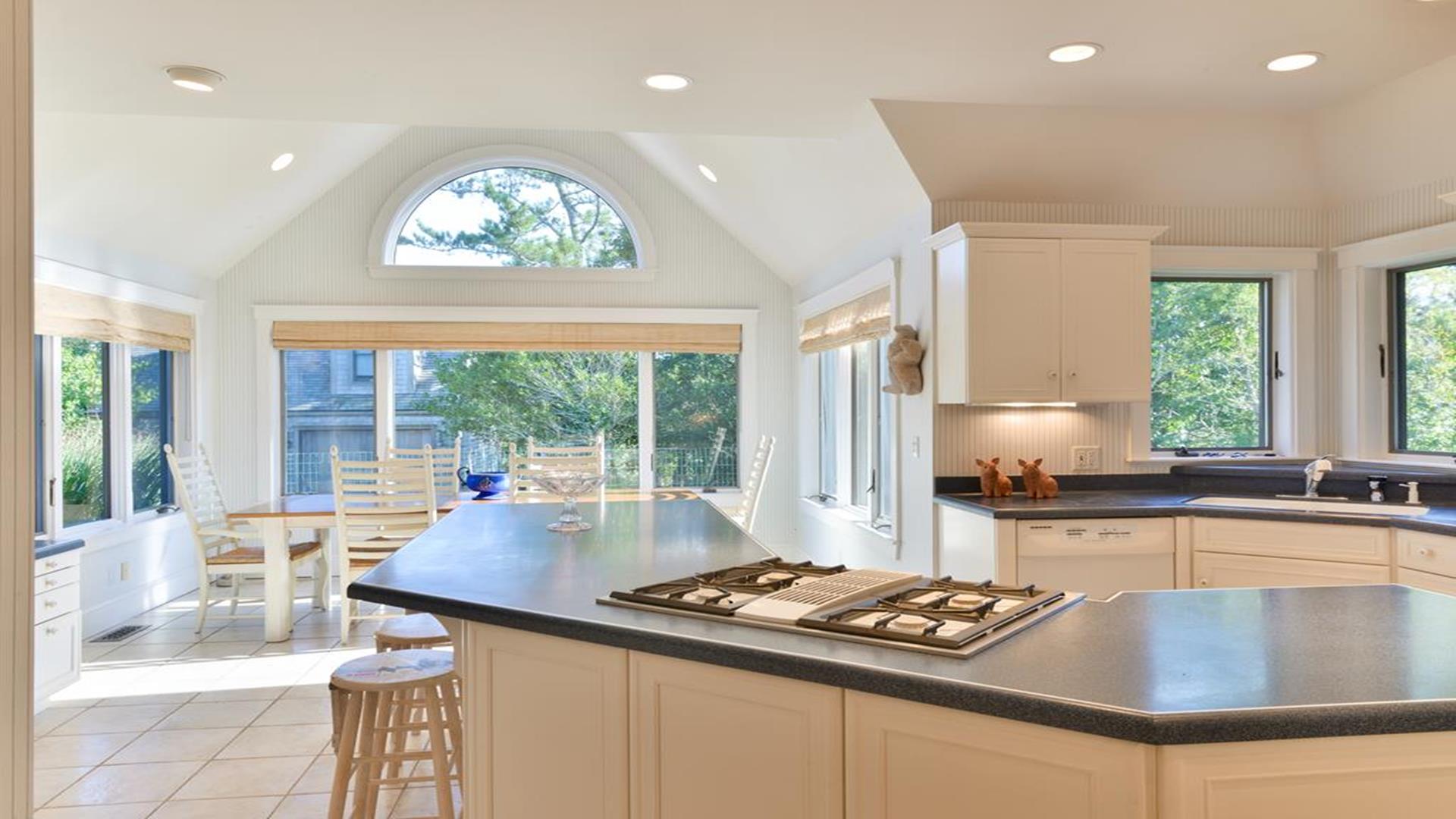 Situated west of Town near Cliff, Dionis and Madaket, this lovely property has 3-bedrooms in the main house, and 1-bedroom in the guest cottage. Main House: Enter through the foyer to a large family room that opens to the dining room with seating for 10. Adjacent to the dining room is a large living room with fireplace and sliding doors leading to the screened in porch, overlooking the bluestone patio with BBQ Grill and expansive manicured lawn. A large bright fully appointed kitchen with breakfast bar seats 3. There is also a charming breakfast nook with dining table seating for 6. Large laundry room, 2 pantries, a powder room and back door entry leading to the outdoor shower. A first floor Master Suite with King bed, sliding doors to back lawn and large bath with whirlpool tub, separate stall shower, dual sinks and decorative tile. Second floor: 2 queen bedrooms share full hall bathroom. Separate sitting area at the top of the stairs. Lower level: Home theater in basement seats 14. Guest cottage with 1-bedroom, kitchen, living room with pull out sofa in den and 2 full bathrooms. Large private deck.