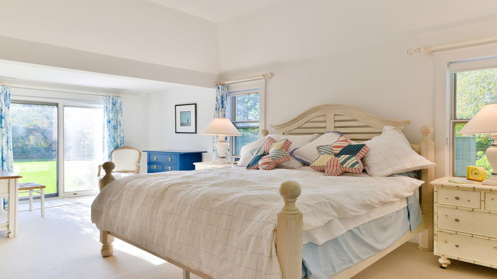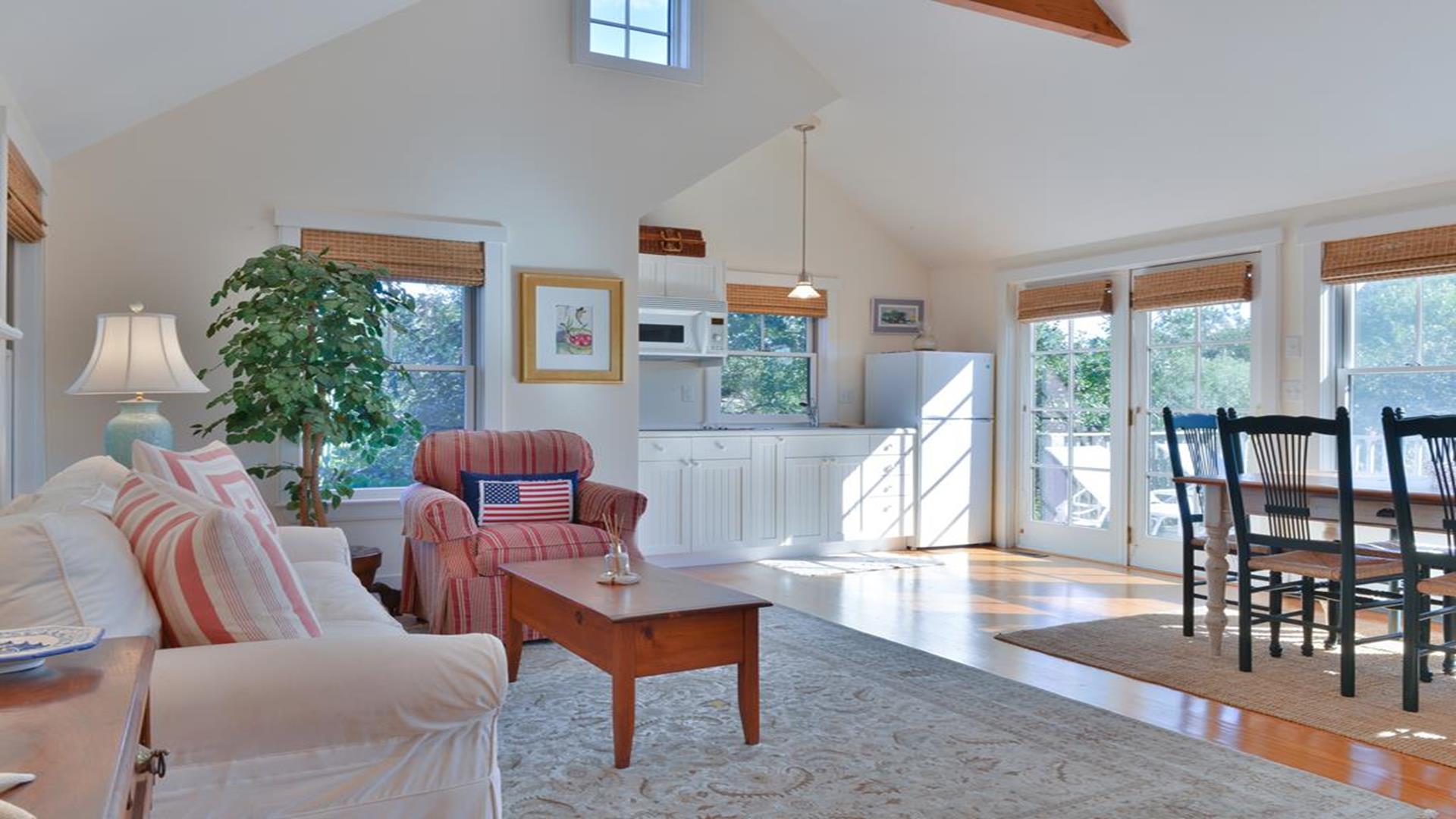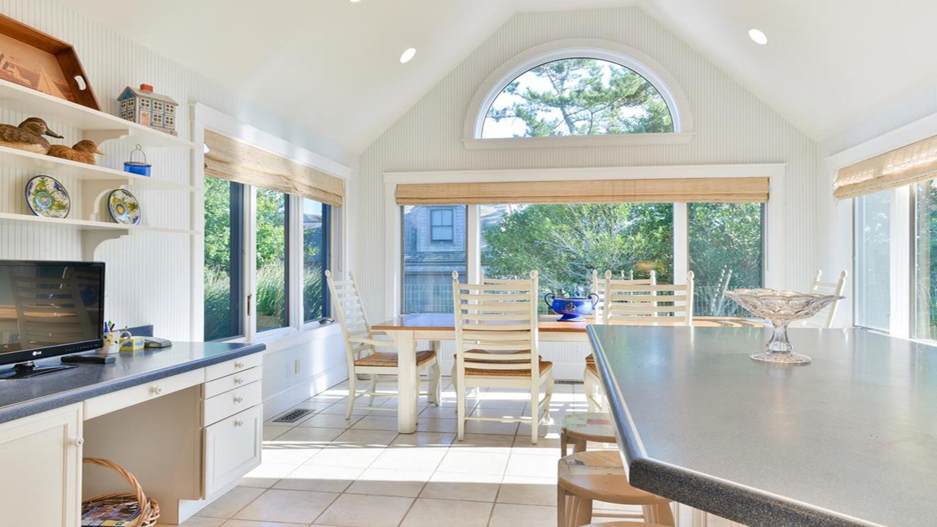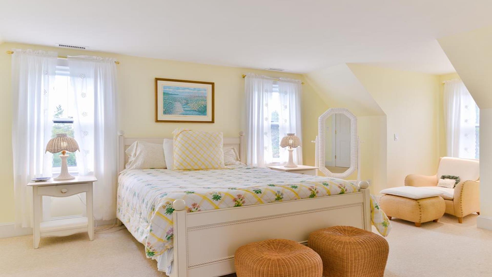 Situated west of Town near Cliff, Dionis and Madaket, this lovely property has 3-bedrooms in the main house, and 1-bedroom in the guest cottage. Main House: Enter through the foyer to a large family room that opens to the dining room with seating for 10. Adjacent to the dining room is a large living room with fireplace and sliding doors leading to the screened in porch, overlooking the bluestone patio with BBQ Grill and expansive manicured lawn. A large bright fully appointed kitchen with breakfast bar seats 3. There is also a charming breakfast nook with dining table seating for 6. Large laundry room, 2 pantries, a powder room and back door entry leading to the outdoor shower. A first floor Master Suite with King bed, sliding doors to back lawn and large bath with whirlpool tub, separate stall shower, dual sinks and decorative tile. Second floor: 2 queen bedrooms share full hall bathroom. Separate sitting area at the top of the stairs. Lower level: Home theater in basement seats 14. Guest cottage with 1-bedroom, kitchen, living room with pull out sofa in den and 2 full bathrooms. Large private deck.