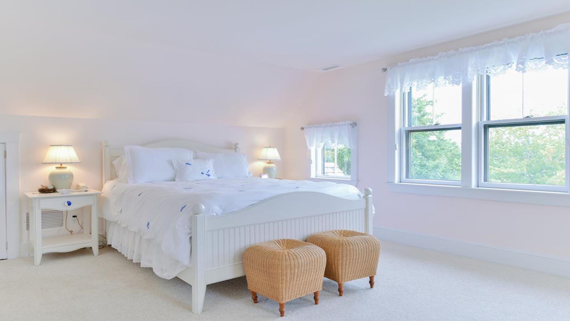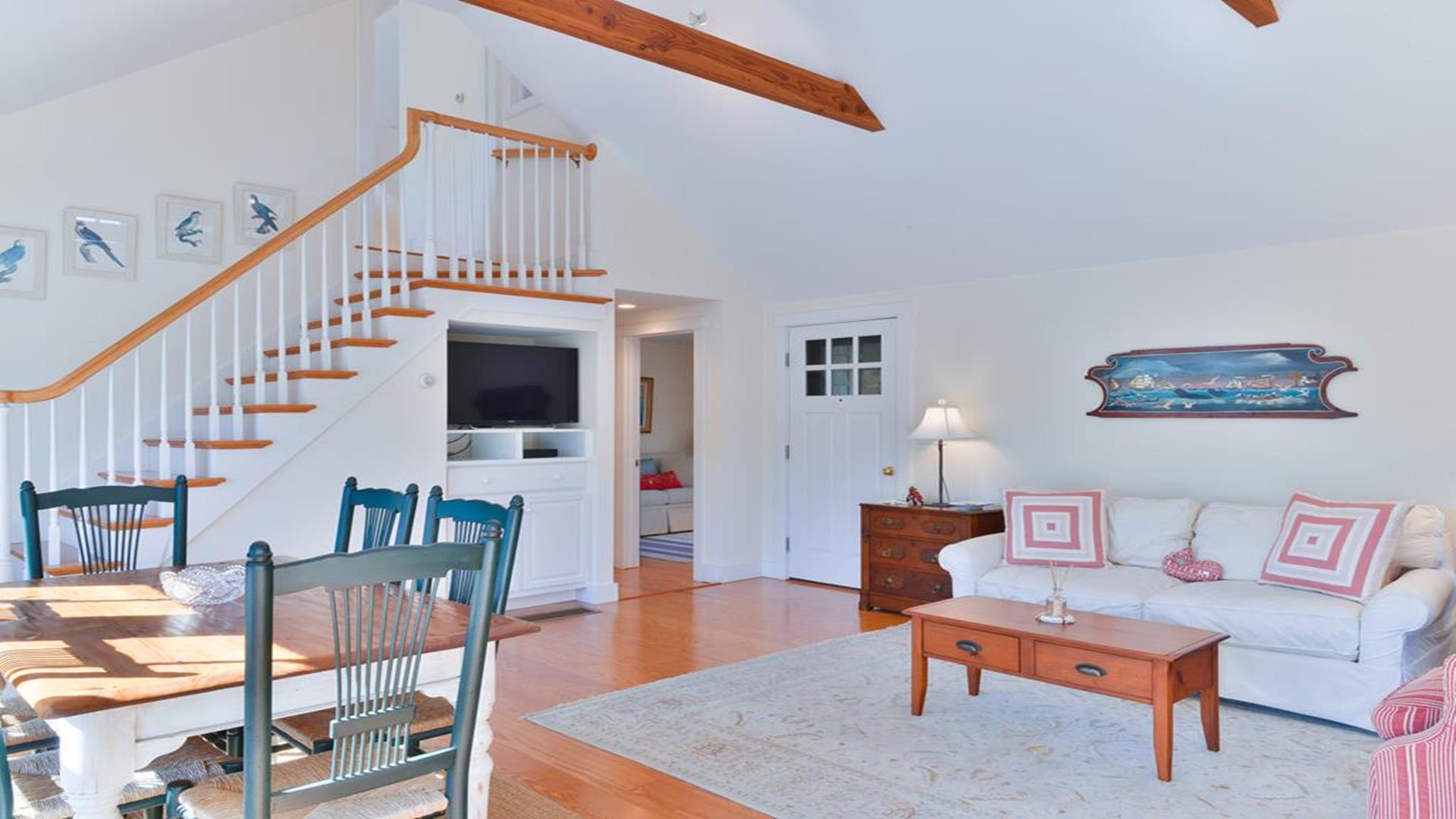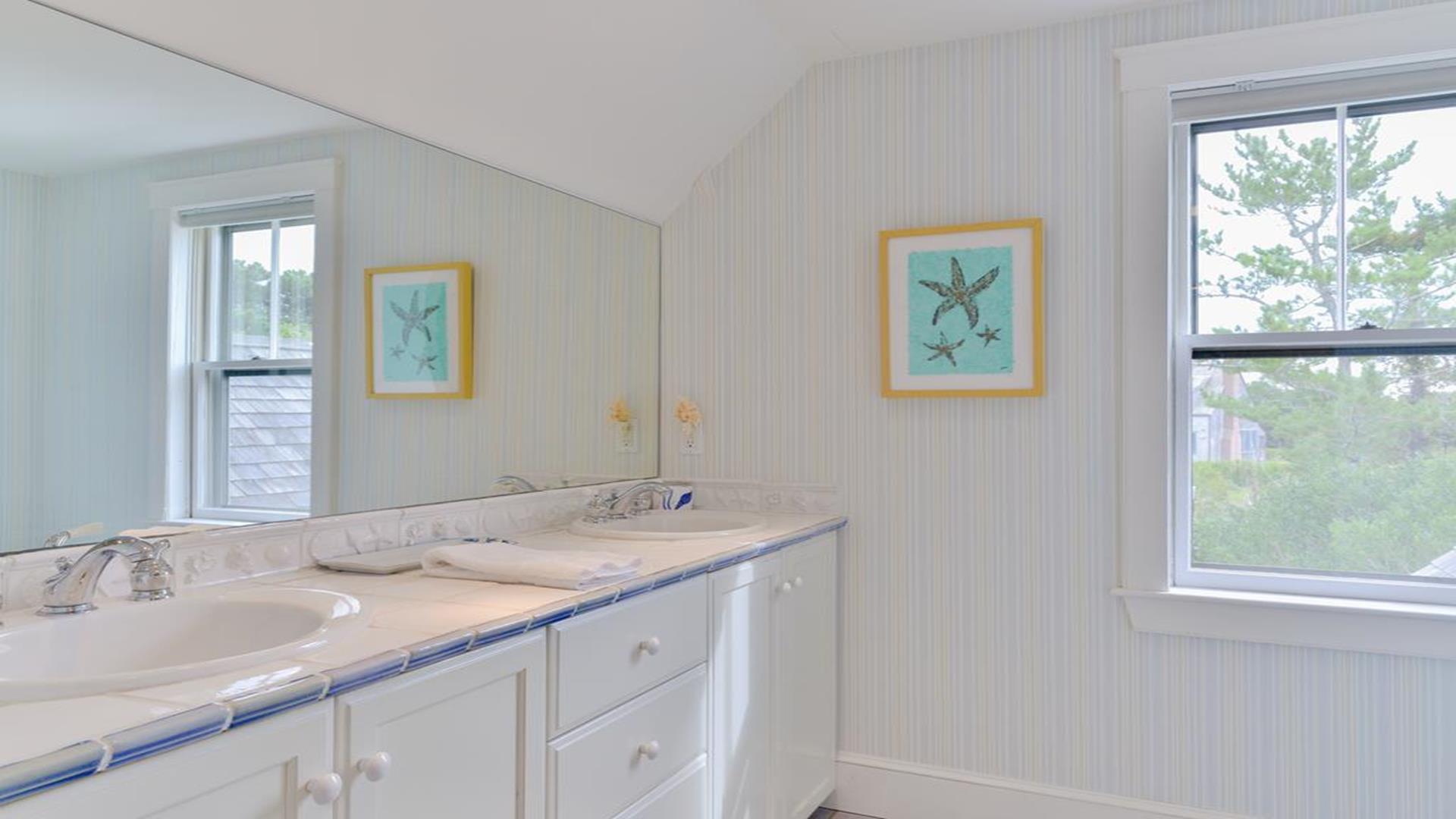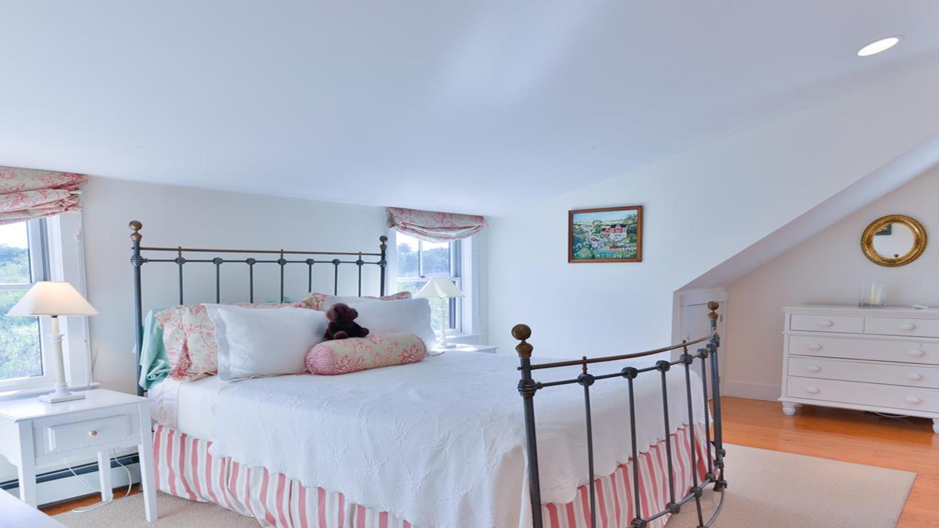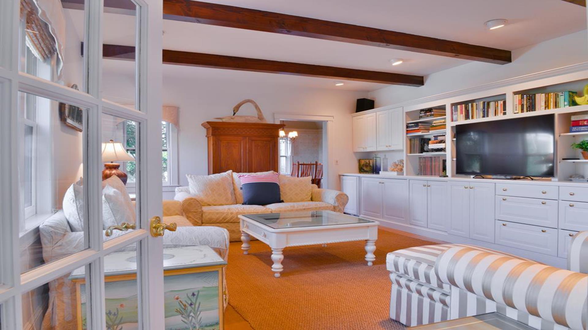 Situated west of Town near Cliff, Dionis and Madaket, this lovely property has 3-bedrooms in the main house, and 1-bedroom in the guest cottage. Main House: Enter through the foyer to a large family room that opens to the dining room with seating for 10. Adjacent to the dining room is a large living room with fireplace and sliding doors leading to the screened in porch, overlooking the bluestone patio with BBQ Grill and expansive manicured lawn. A large bright fully appointed kitchen with breakfast bar seats 3. There is also a charming breakfast nook with dining table seating for 6. Large laundry room, 2 pantries, a powder room and back door entry leading to the outdoor shower. A first floor Master Suite with King bed, sliding doors to back lawn and large bath with whirlpool tub, separate stall shower, dual sinks and decorative tile. Second floor: 2 queen bedrooms share full hall bathroom. Separate sitting area at the top of the stairs. Lower level: Home theater in basement seats 14. Guest cottage with 1-bedroom, kitchen, living room with pull out sofa in den and 2 full bathrooms. Large private deck.