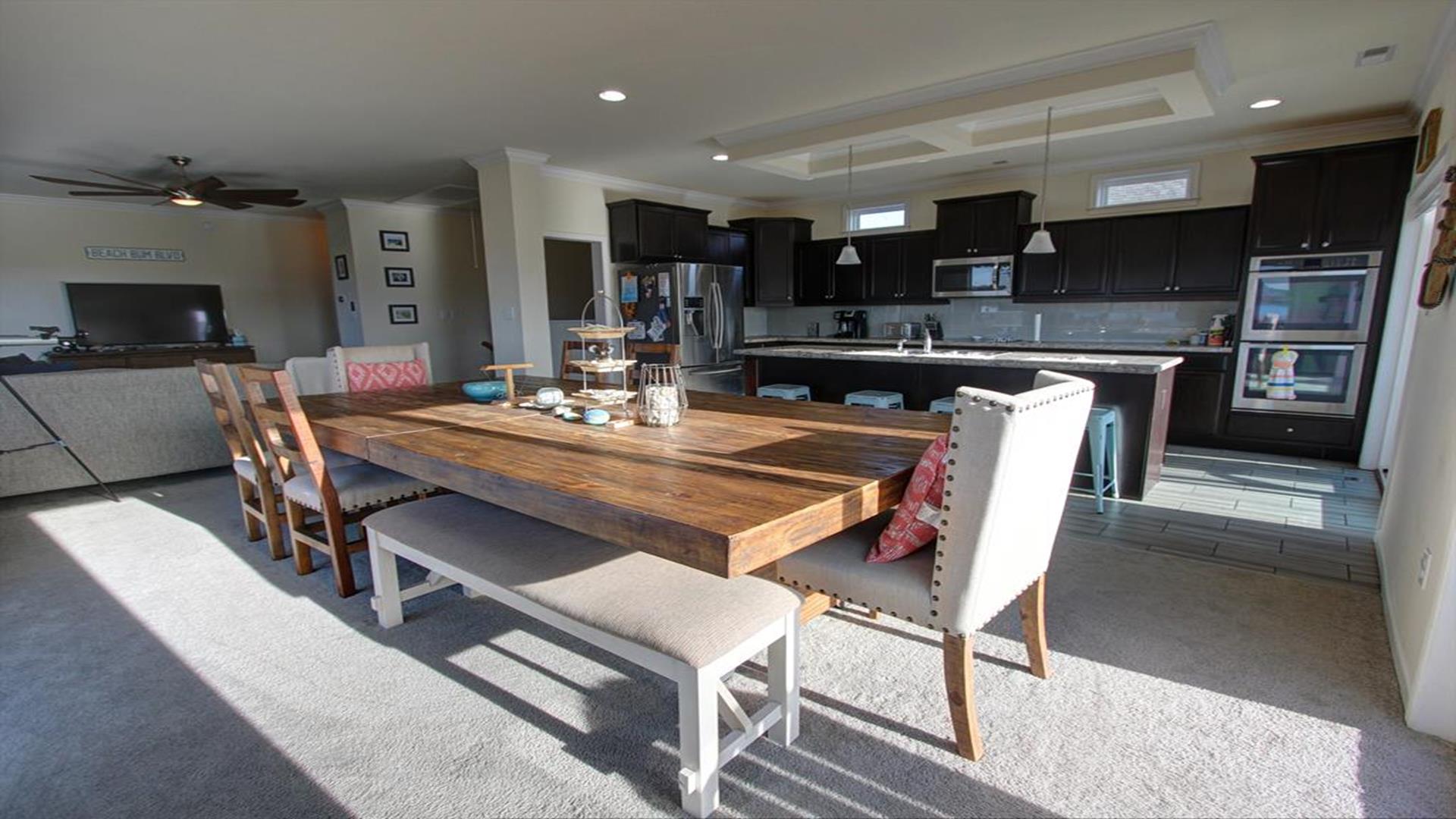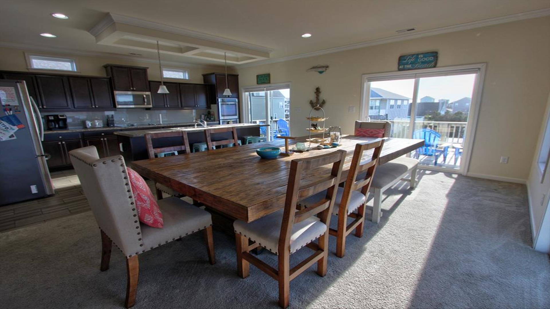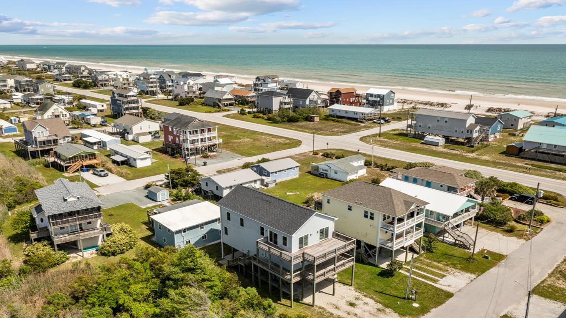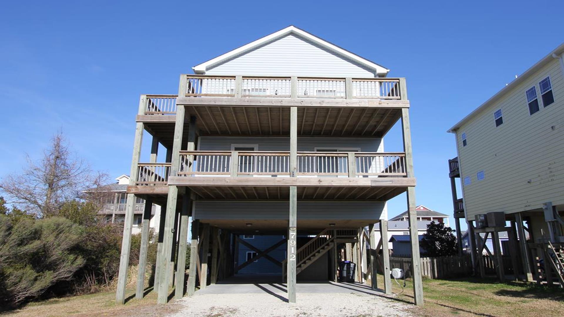 Enjoy amazing water views from this beautiful beach house. From the large wraparound decks, you can see the ocean, beach access, and panoramic views of the waterway. On the top floor with the best views, there is a spacious living, dining, and kitchen area. The huge dining table is perfect for family meals and gathering for games. There is a king bedroom with a private bath along with a half bath on this level. On the first floor, there is another king bedroom with private bath and a door to the covered deck. The third bedroom has two queen beds. The fourth bedroom has a pyramid bunkbed and a double bed. There is a hall bath with tub/shower and a separate laundry room. On the ground level, there is a covered area with furniture, grill, and storage building. The beach access is only a short distance away and best of all, you can bring your pet w/$215 fee for 1 dog. *Keyless Entry, Exterior Security Camera 4 BR, 3.5 Baths / Occupancy Limit: 12 - 2 K, 2 Q, 2 D, 1 T, LINENS ARE NOT INCLUDED unless purchased NO SMOKING ALLOWED