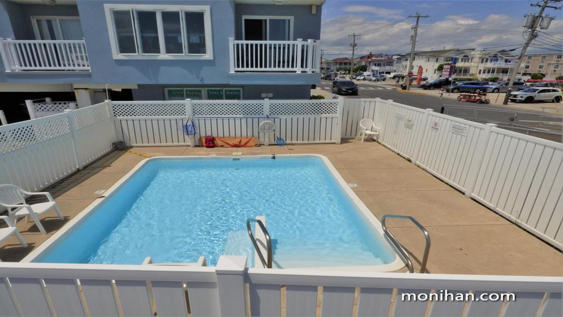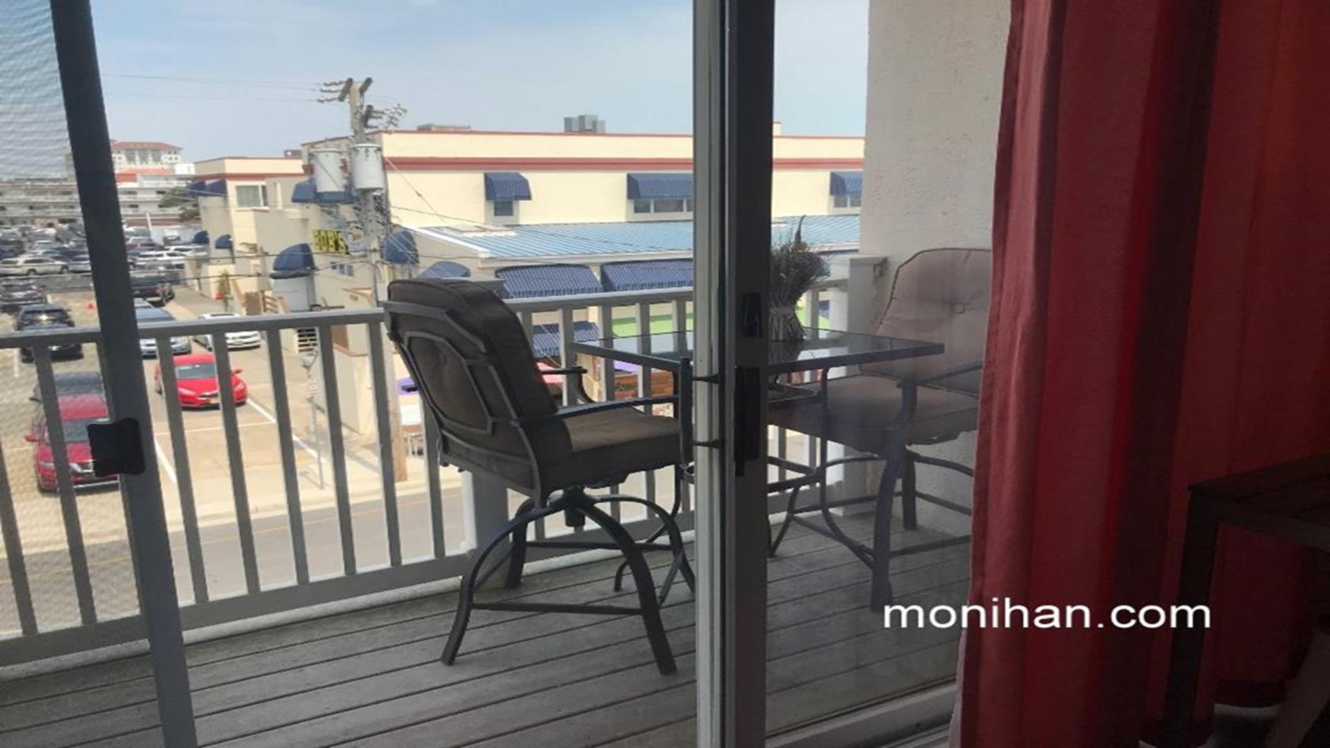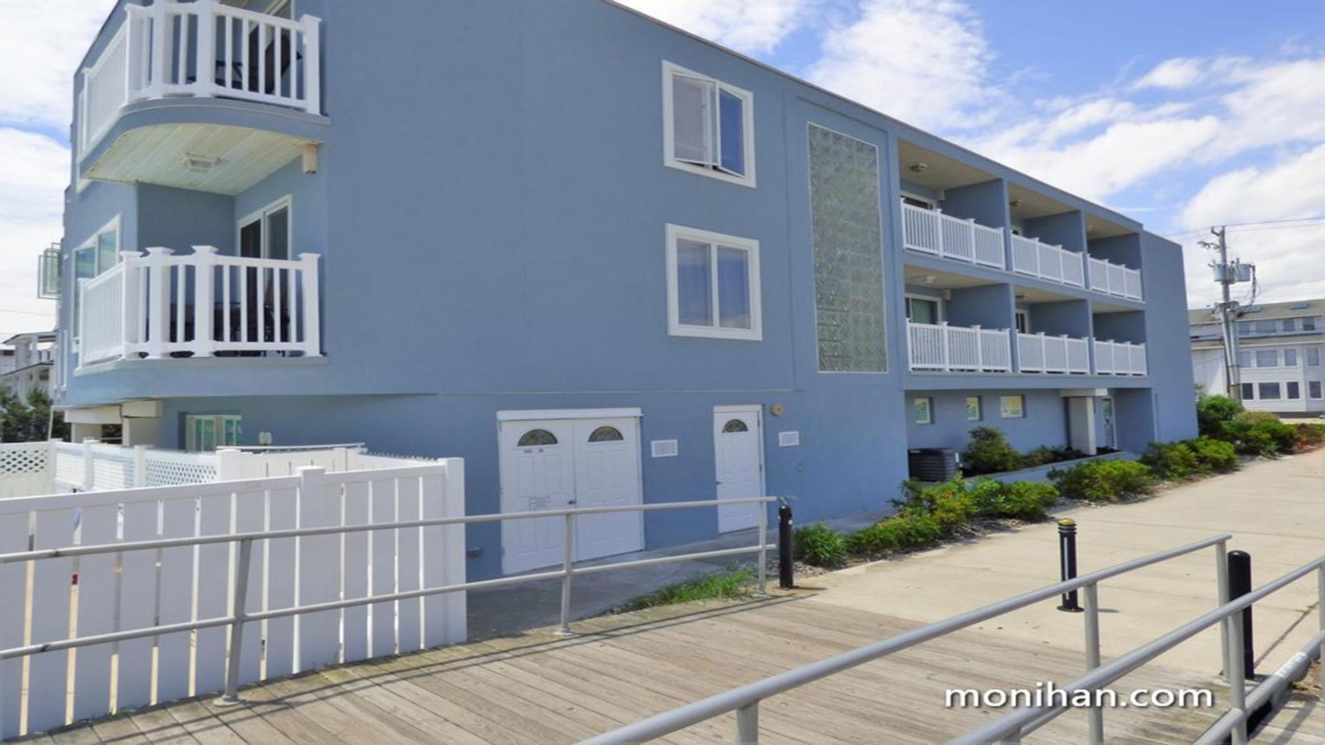 BEACH, BOARDWALK AND POOL! This ocean view condo is waiting for you! Beautiful one bedroom, one bath north side unit in a boardwalk fronted building overlooking 14th Street and Bob's Grill, sleeps up to 4 people. Private balcony with ocean views, full size fridge, dishwasher, private bedroom, central air cable tv, internet, queen sofa bed and futon in living room, extra pillows and two beach tags. The Building features an elevator, one assigned off street garage parking space, bike rack, outside shower, POOL (open daily 10-5 mid-June through mid September.) This is a great place to stay and enjoy Ocean City!