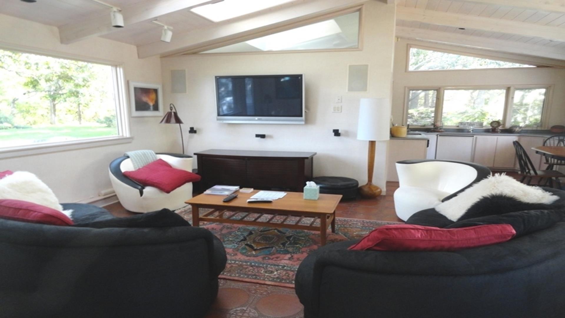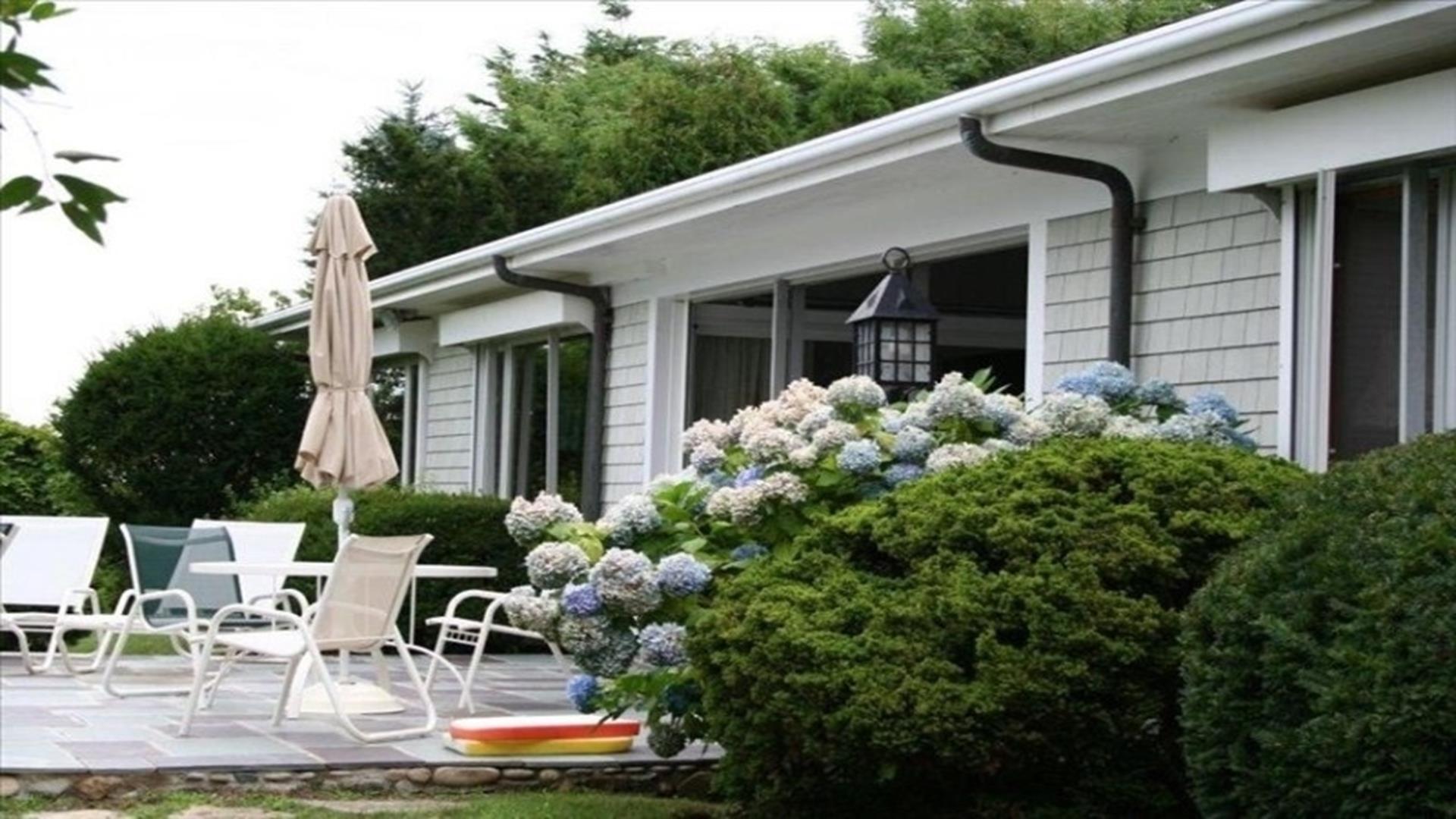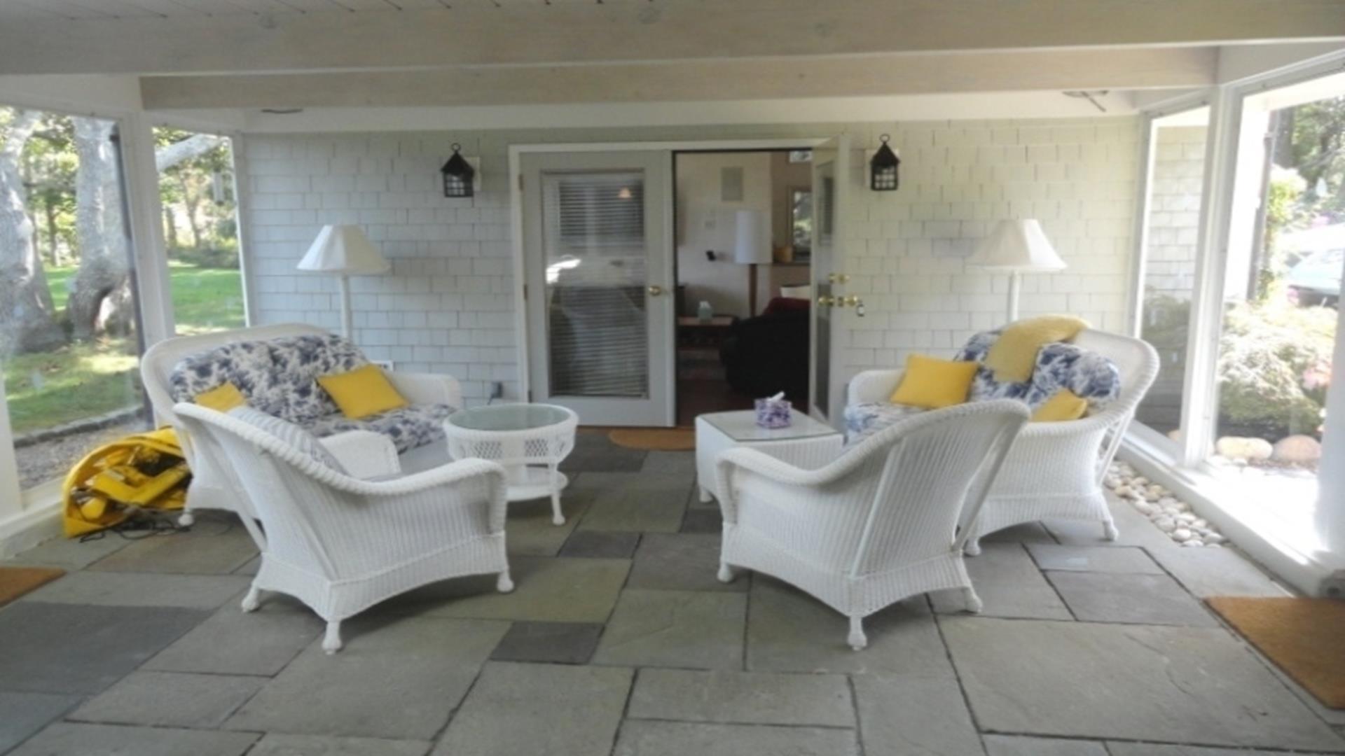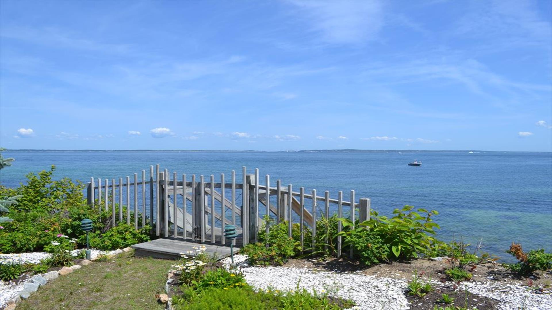 Magical is truly the best way to describe this waterfront location overlooking the Vineyard Sound, the Elizabeth Islands and Woods Hole. Set on 14 private, pastoral landscaped acres on the water in Upper Makonikey. Have a front row seat to gorgeous sunsets on your secluded private 325 foot beach. This casual and comfortable single level four bedroom three bath home has central air, power generator and many unexpected bells and whistles that add to the comfort of this home. Enjoy summer star-studded skies from your patio or through skylights in each bedroom. Open living dining area. Small but functional galley kitchen with high-end appliances. The glassed-in breezeway offers comfortable wicker furniture to relax in while reading and looking at the gardens. The cottage, attached to the breezeway, is a family great room with plasma TV, Internet access, game table area, studio kitchen: and bath. A boardwalk leads you to a hot tub with a table surround to use for lunch. Nearby is a hot/cold outdoor shower. Follow the boardwalk to a furnished deck at the bluffs edge to enjoy intimate meals while overlooking the ocean. Truly a one of a kind setting.